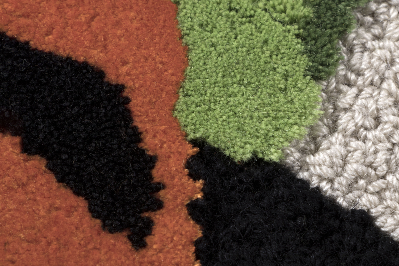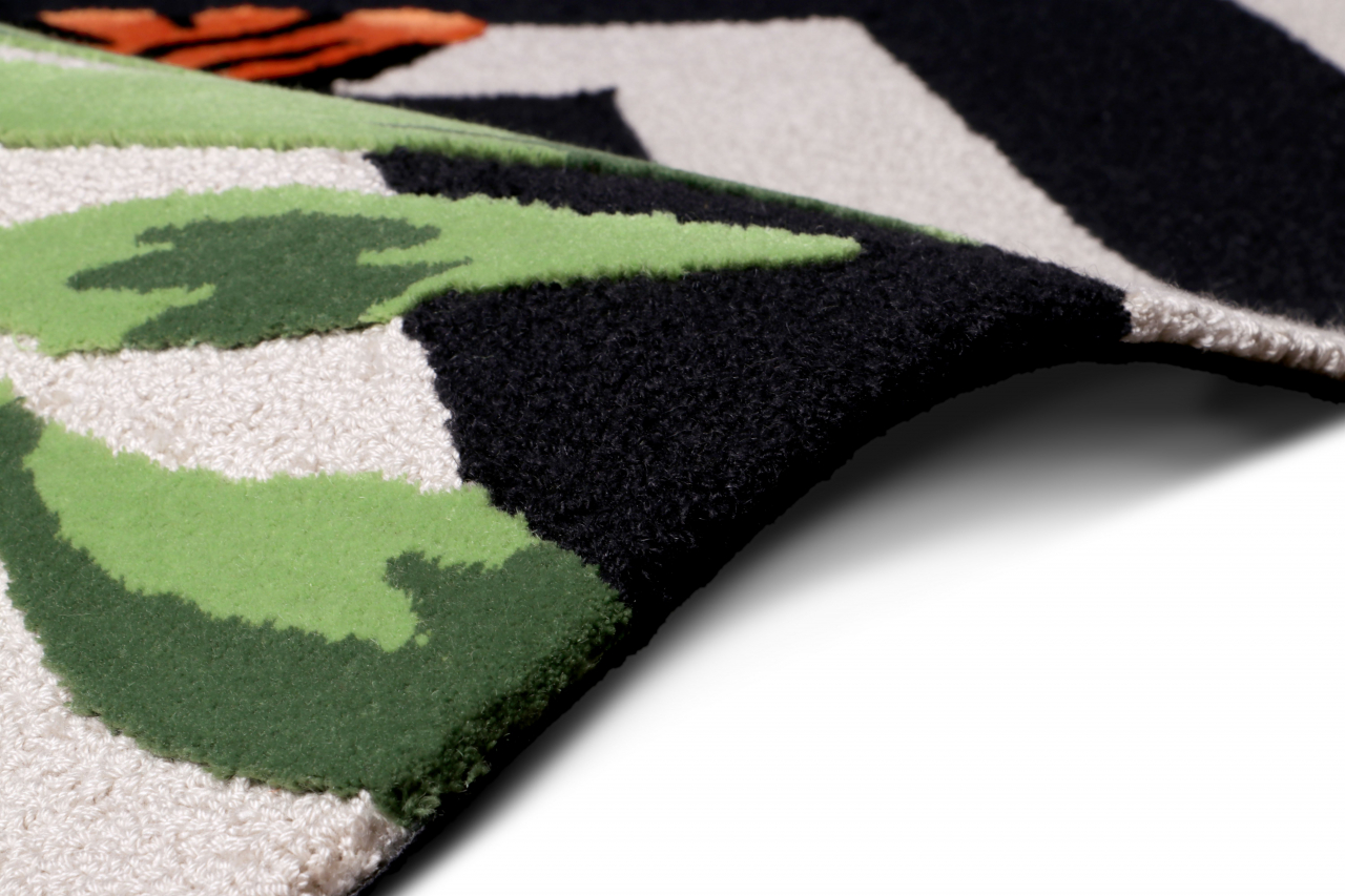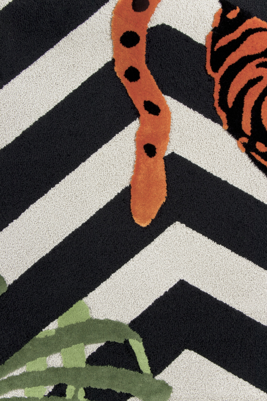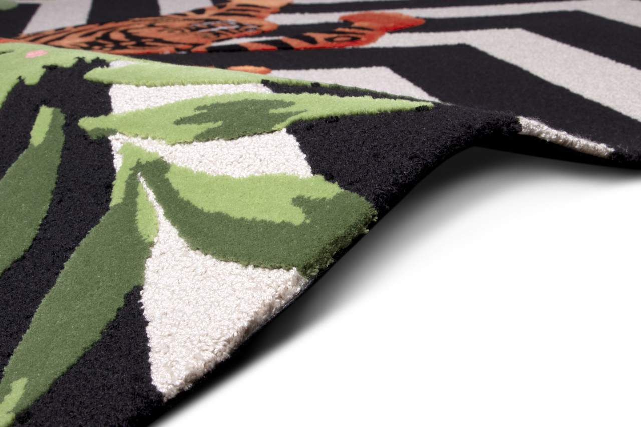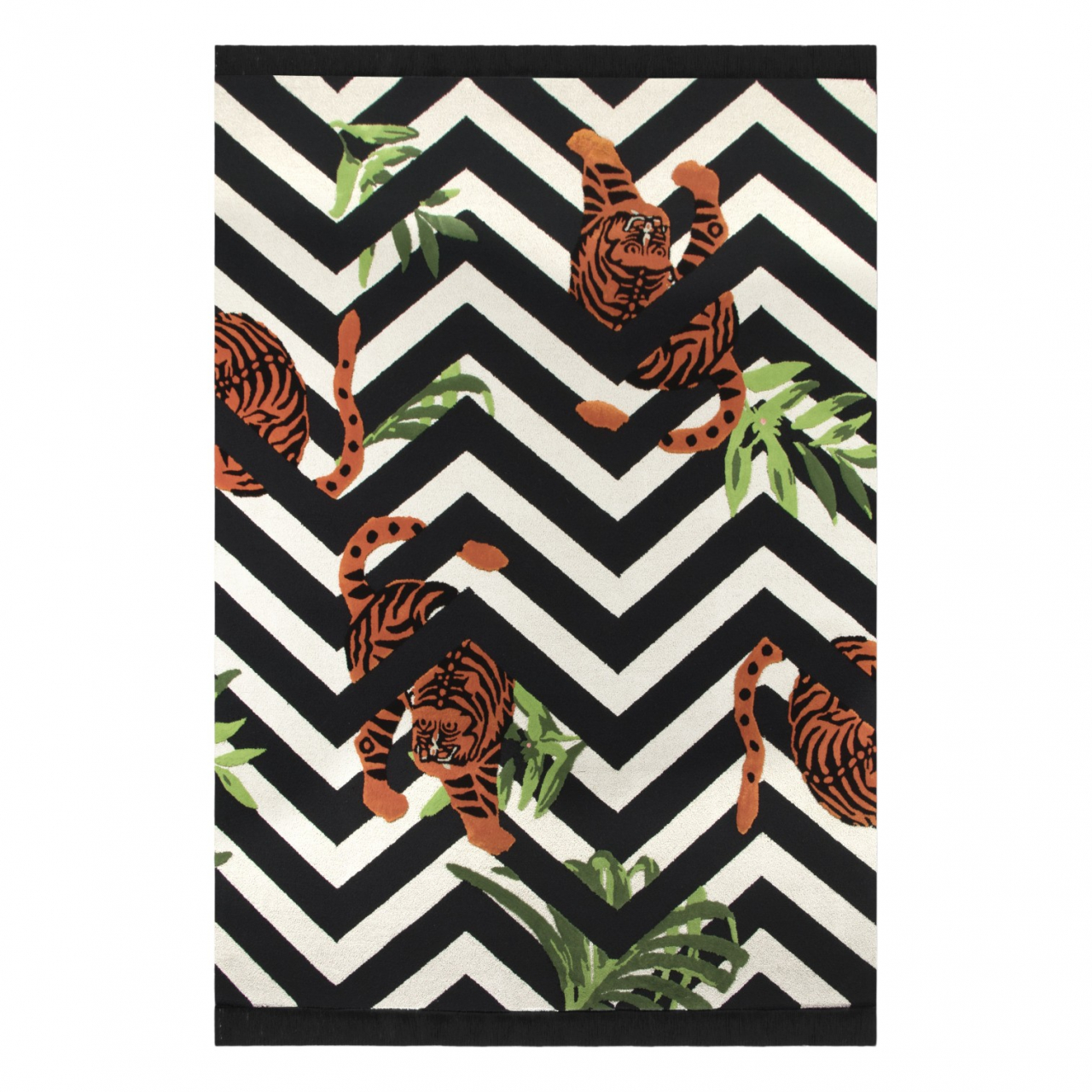 Ковер с ярким графичным рисунком в стиле поп-арт. Контрастный зигзагообразный узор в черно-белой гамме сочетается с изображениями тигров и зелёной листвы, создавая динамичную и игривую композицию. Смелый дизайн делает этот ковер эффектным акцентом в современном интерьере, добавляя пространству энергию, экзотические мотивы и выразительный характер.