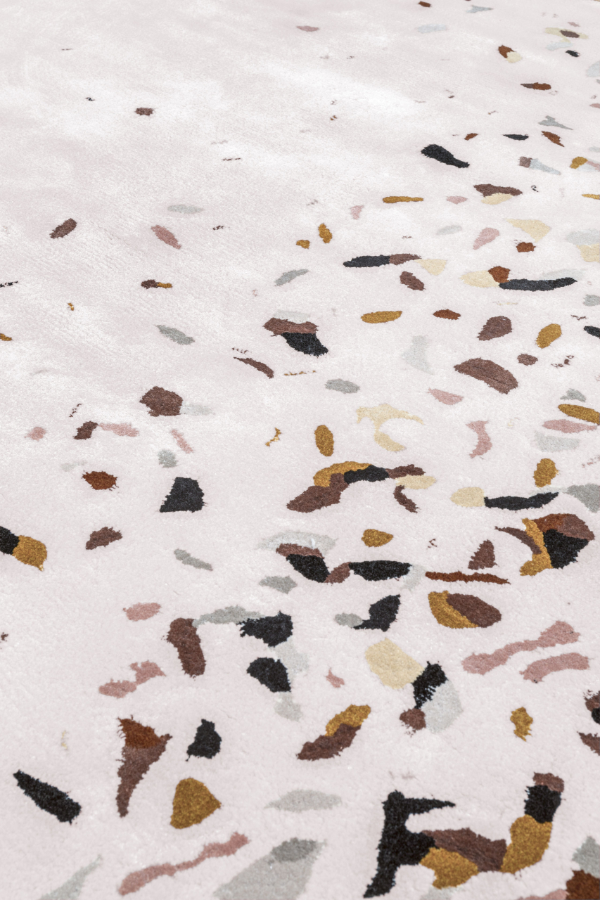 Ковер с утончённым абстрактным рисунком, напоминающим мозаичное рассеивание каменной крошки на светлом фоне. Тёплые оттенки терракоты, охры и графита создают мягкий контраст и ощущение движения. Лёгкий градиентный переход придаёт ковру воздушность и глубину. Такой дизайн прекрасно впишется в современный интерьер, добавив в него текстуру, свет и естественную гармонию.