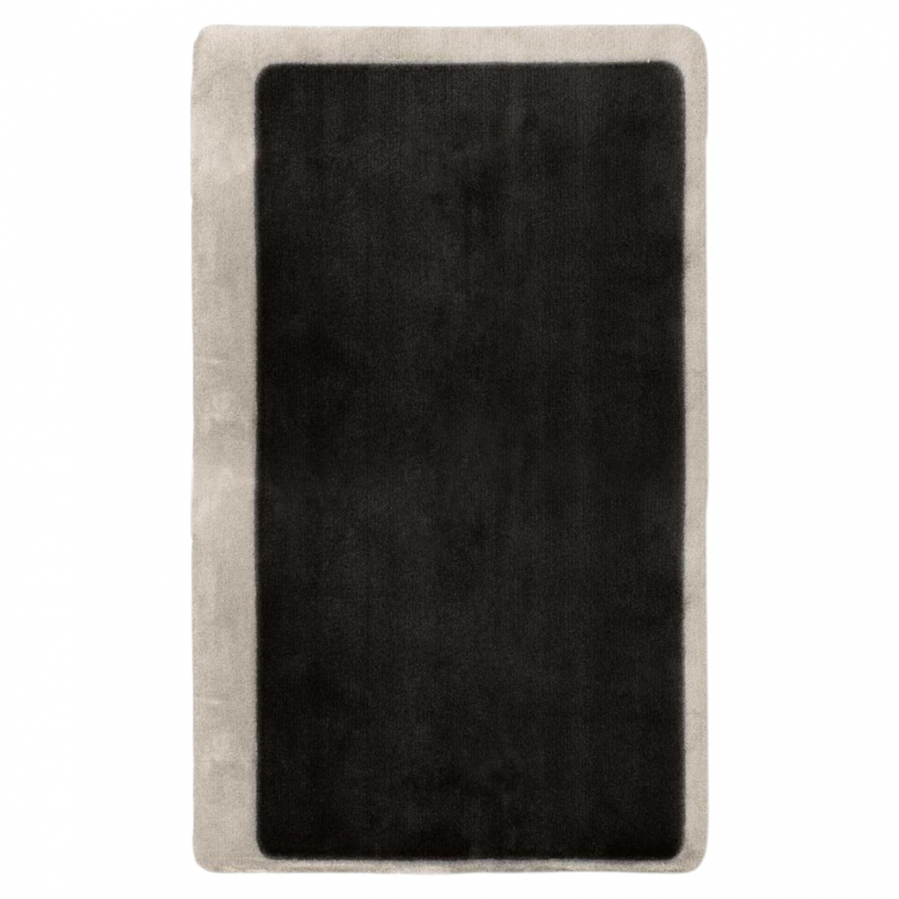 Ковер в минималистичном стиле с чёткой геометрией и мягким контрастом оттенков. Глубокий чёрный центр обрамлён широкой рамкой светло-серого цвета, создающей эффект объёма и визуальной глубины. Лаконичный дизайн подчёркивает архитектурность пространства и легко сочетается с современным или монохромным интерьером. Такой ковер придаст комнате ощущение строгости, элегантности и спокойного баланса.