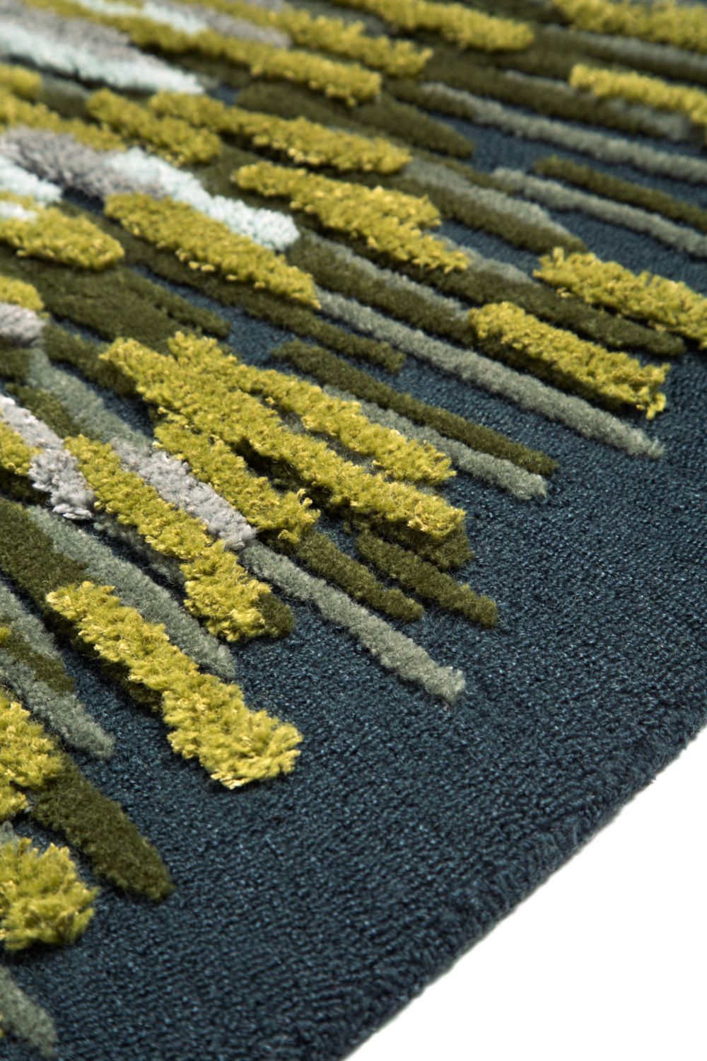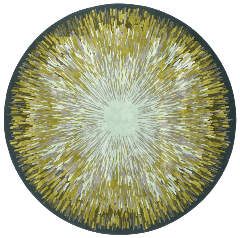 Ковер круглой формы с эффектным радиальным рисунком, напоминающим солнечные лучи или вспышку света. Золотистые, серебристые и светло-серые оттенки создают ощущение сияния и энергии, а тёмная окантовка подчёркивает глубину композиции. Такой ковер станет центральным элементом интерьера — он добавит пространству динамику, свет и утончённую роскошь.