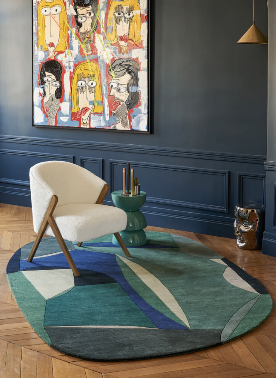 Современный ковер с абстрактным рисунком в приглушённых тонах зелёного. Нестандартная овальная форма и многослойная композиция напоминают фрагменты природных ландшафтов или кубистические формы. Мягкие переходы цвета создают ощущение глубины и движения. Такой ковер станет элегантным акцентом в интерьере, добавляя пространству художественность и спокойную утончённость.