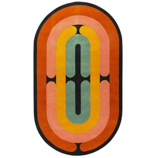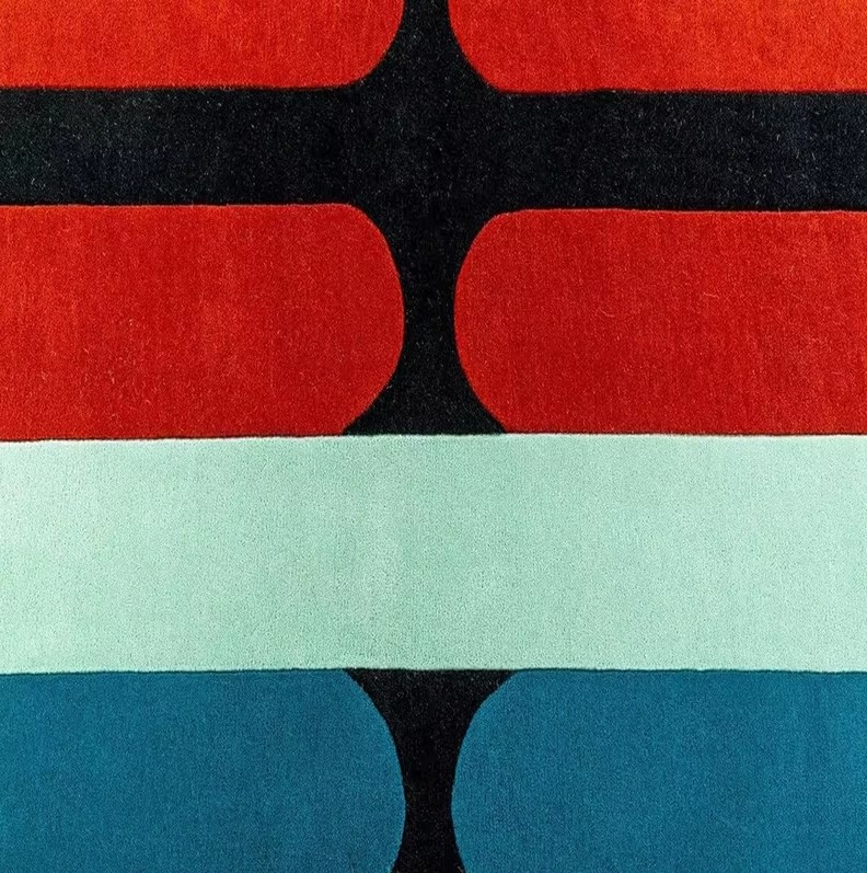 Ковер в стиле модерн с выразительным графичным рисунком и насыщенной цветовой палитрой. Геометрический орнамент в оттенках синего, голубого, красного и чёрного создает динамичную композицию, напоминающую абстрактное искусство середины XX века. Мягкая текстура и плавные линии придают ковру уют, а яркие цвета делают его акцентом в интерьере, подчёркивая современный характер пространства.