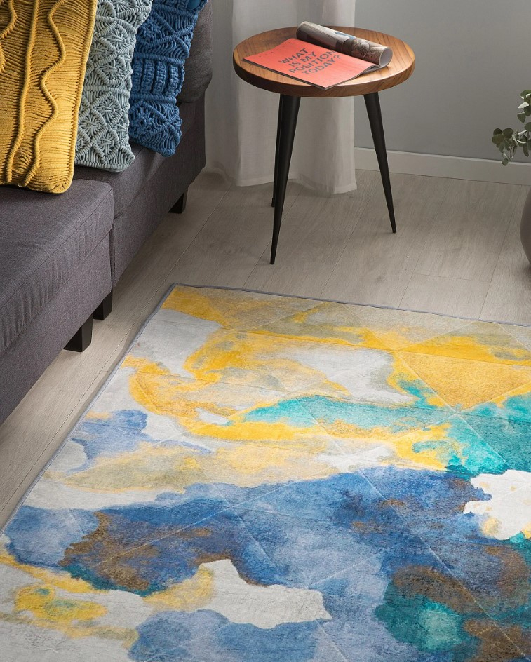 Ковер с эффектом акварельного рисунка в яркой, вдохновляющей палитре. Мягкие переходы синих, бирюзовых и золотисто-жёлтых оттенков создают ощущение движения — словно водная гладь, отражающая солнечный свет. Абстрактный рисунок добавляет интерьеру глубину и художественный характер. Такой ковер идеально подойдёт для современных пространств, привнося свежесть, энергию и ощущение лёгкости.
