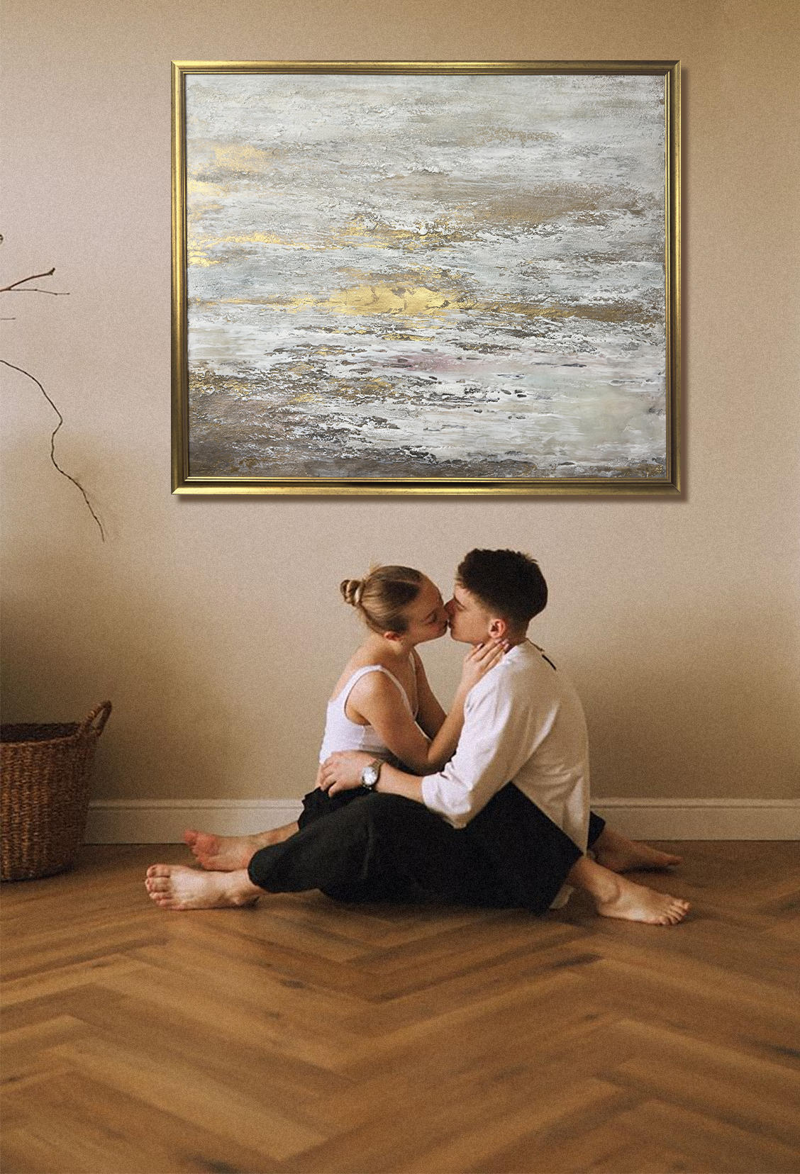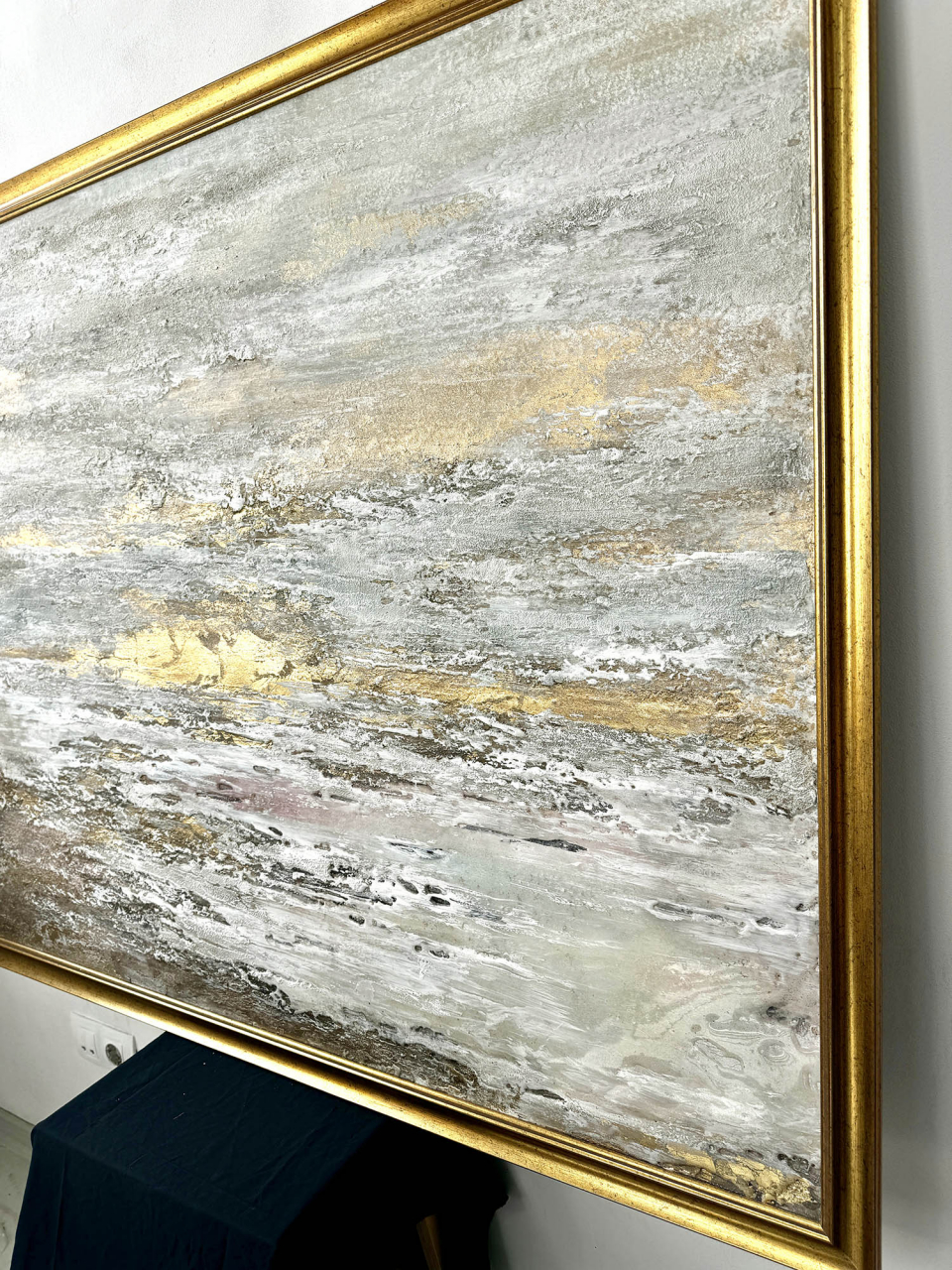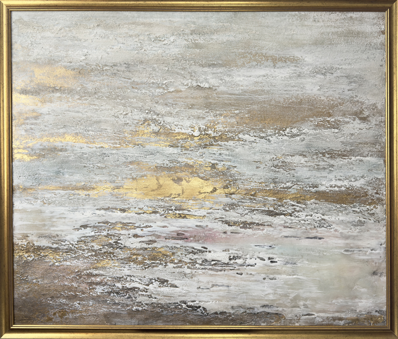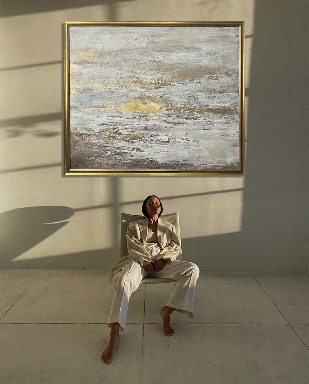 Поверхность полотна построена как поле возможности. Светлые слои ложатся мягко, почти дышат, создавая ощущение прозрачности, где зритель может двигаться взглядом без сопротивления. Фактура рельефная, телесная, работает как топография внутреннего пути: будто скульптура, спрятанная внутри живописи.Глянцевые участки отражают свет и возвращают его обратно в зал. Это важный жест: картина буквально включает в себя окружающее пространство, делая зрителя её частью. Золото же появляется вспышками ясности — не как декоративная роскошь, а как намёк на момент прозрения, когда всё вдруг становится понятным на секунду.