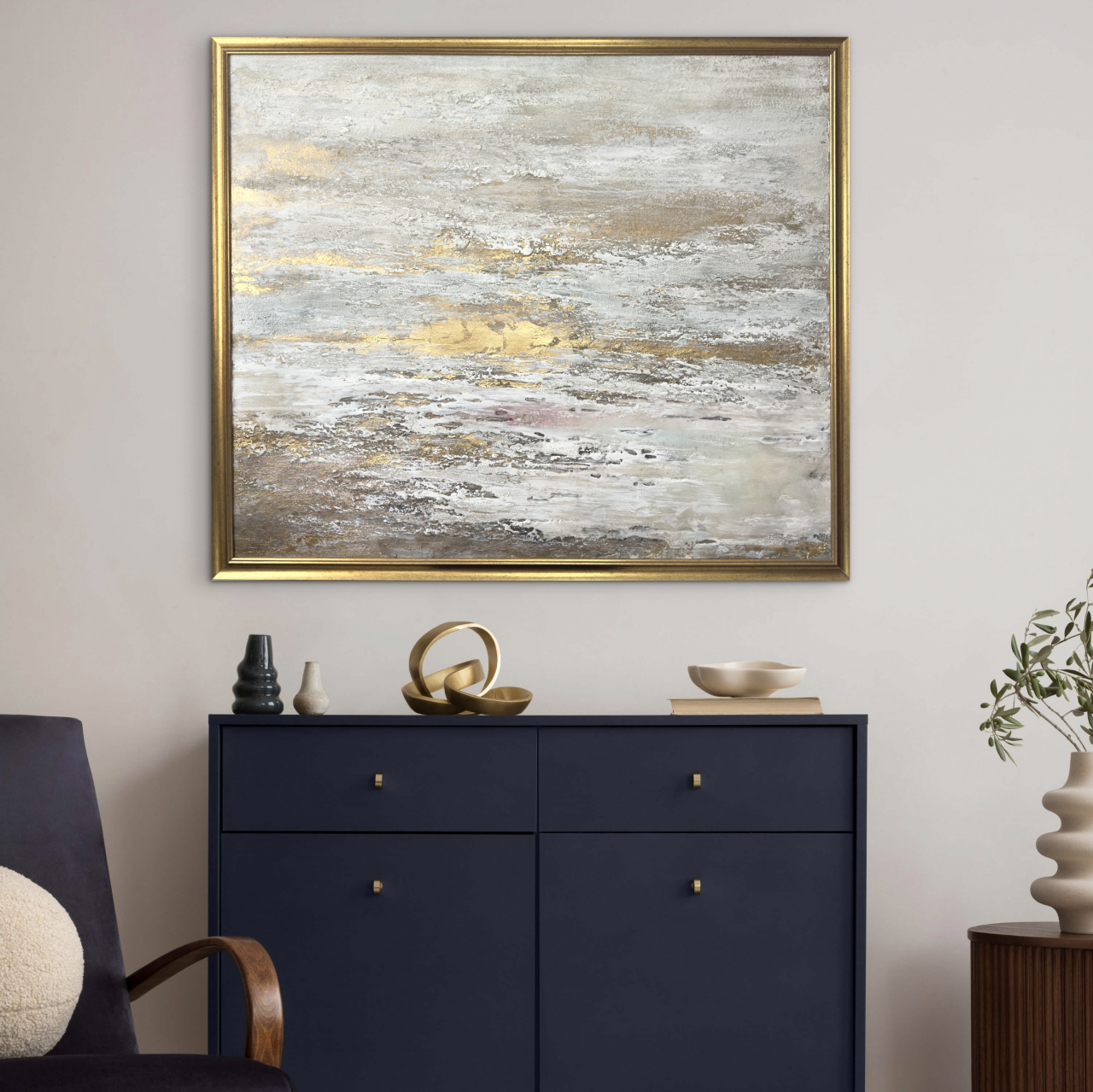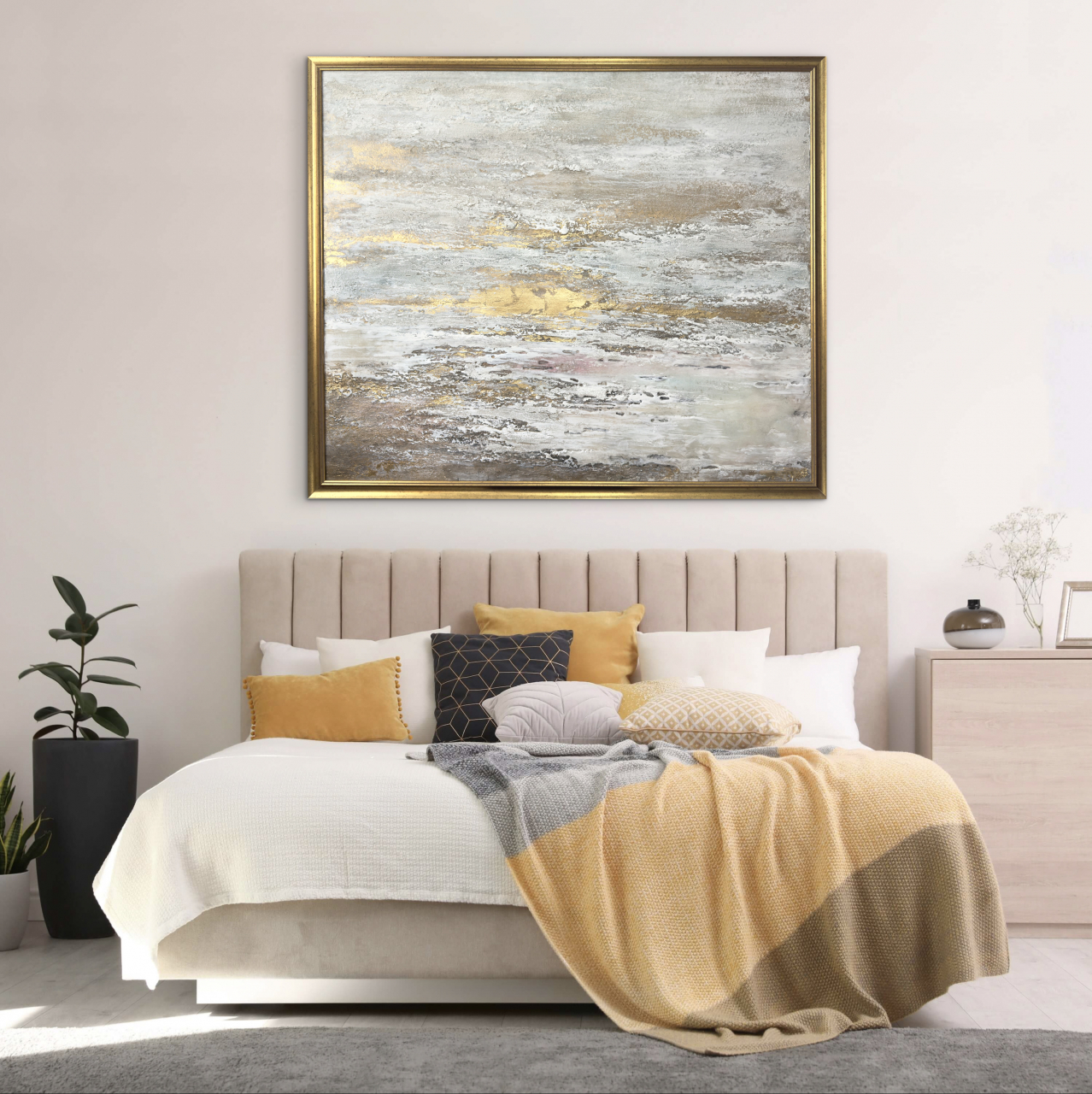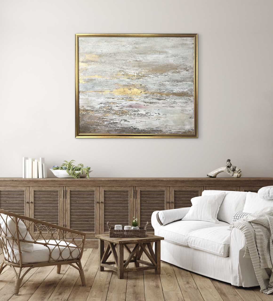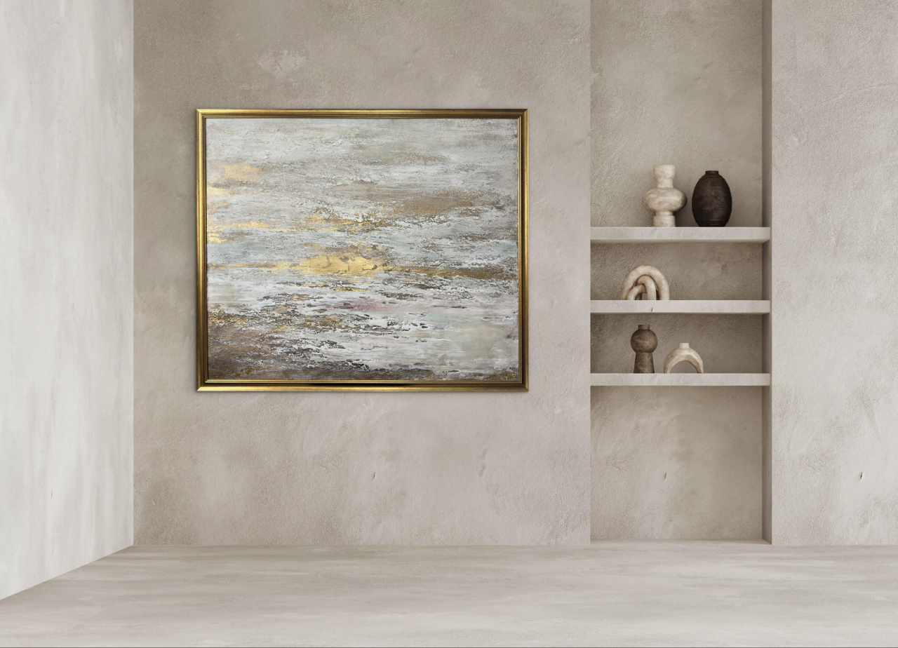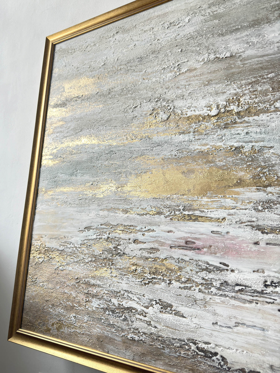 Поверхность полотна построена как поле возможности. Светлые слои ложатся мягко, почти дышат, создавая ощущение прозрачности, где зритель может двигаться взглядом без сопротивления. Фактура рельефная, телесная, работает как топография внутреннего пути: будто скульптура, спрятанная внутри живописи.Глянцевые участки отражают свет и возвращают его обратно в зал. Это важный жест: картина буквально включает в себя окружающее пространство, делая зрителя её частью. Золото же появляется вспышками ясности — не как декоративная роскошь, а как намёк на момент прозрения, когда всё вдруг становится понятным на секунду.