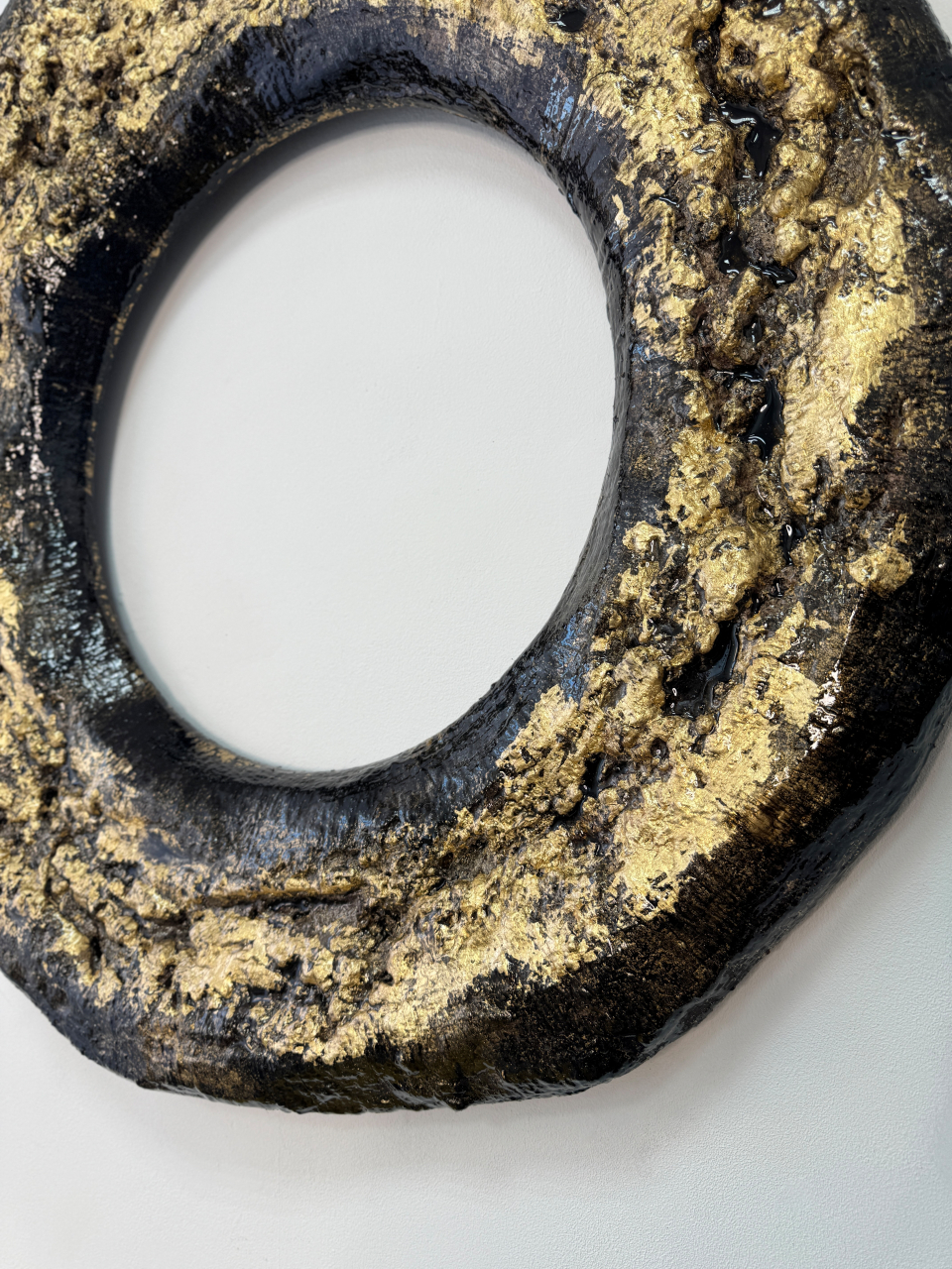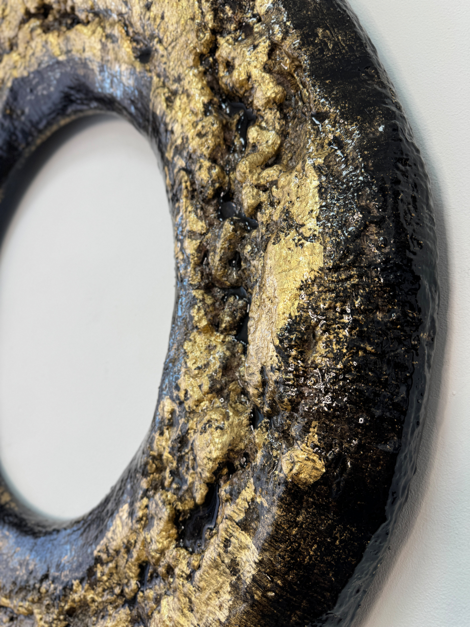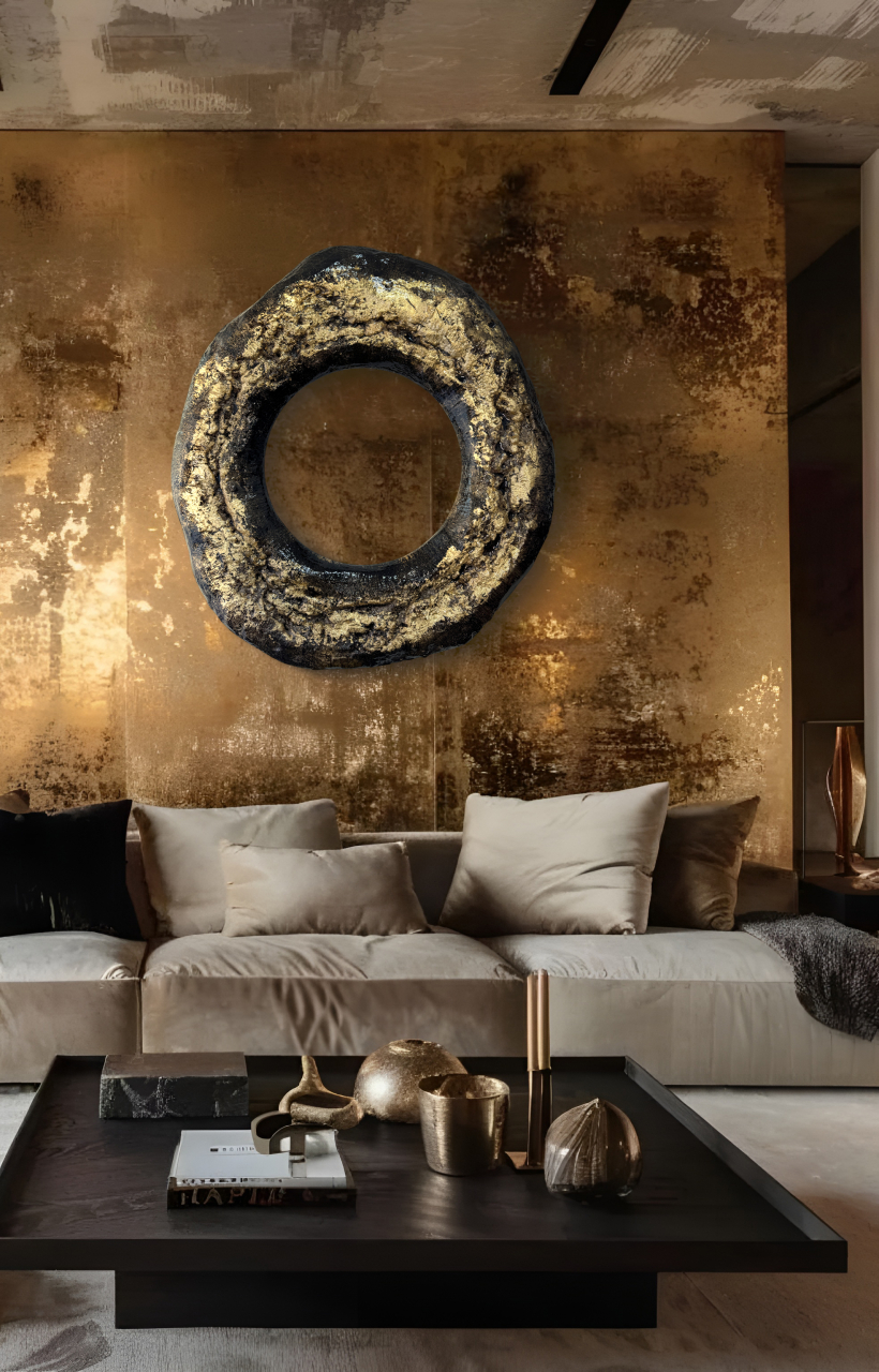 Глубокий чёрный цвет словно поглощает свет, а рельефная фактура с золотыми акцентами напоминает природный разлом, застывшую лаву или древний минерал, внутри которого скрыта энергия. Контраст матовой темноты и благородного золота создаёт драматичный, выразительный образ.