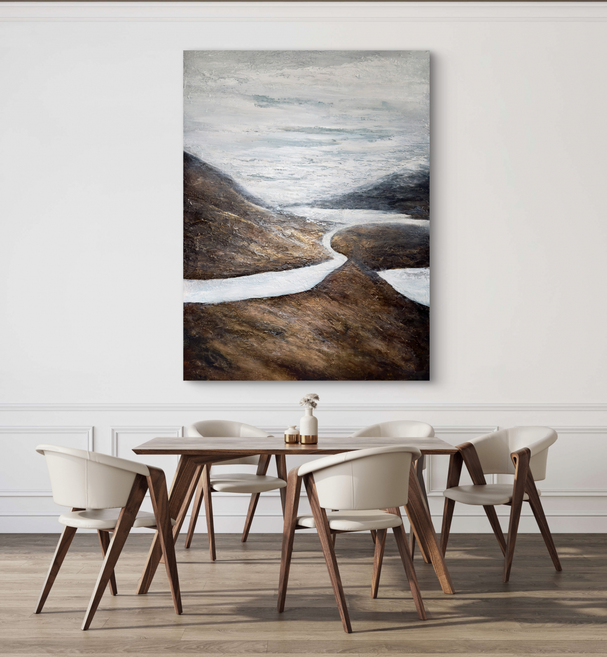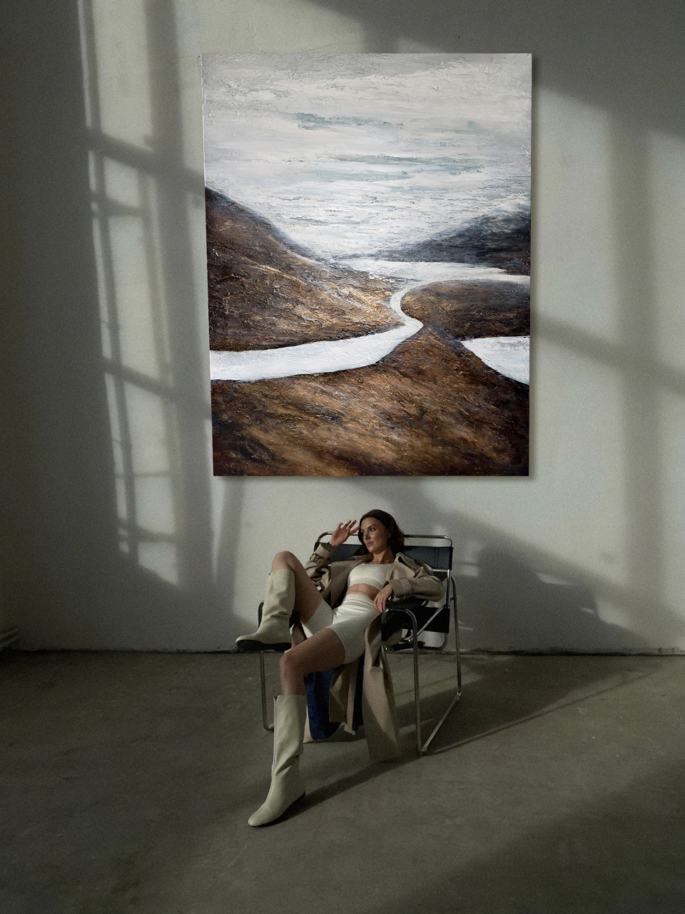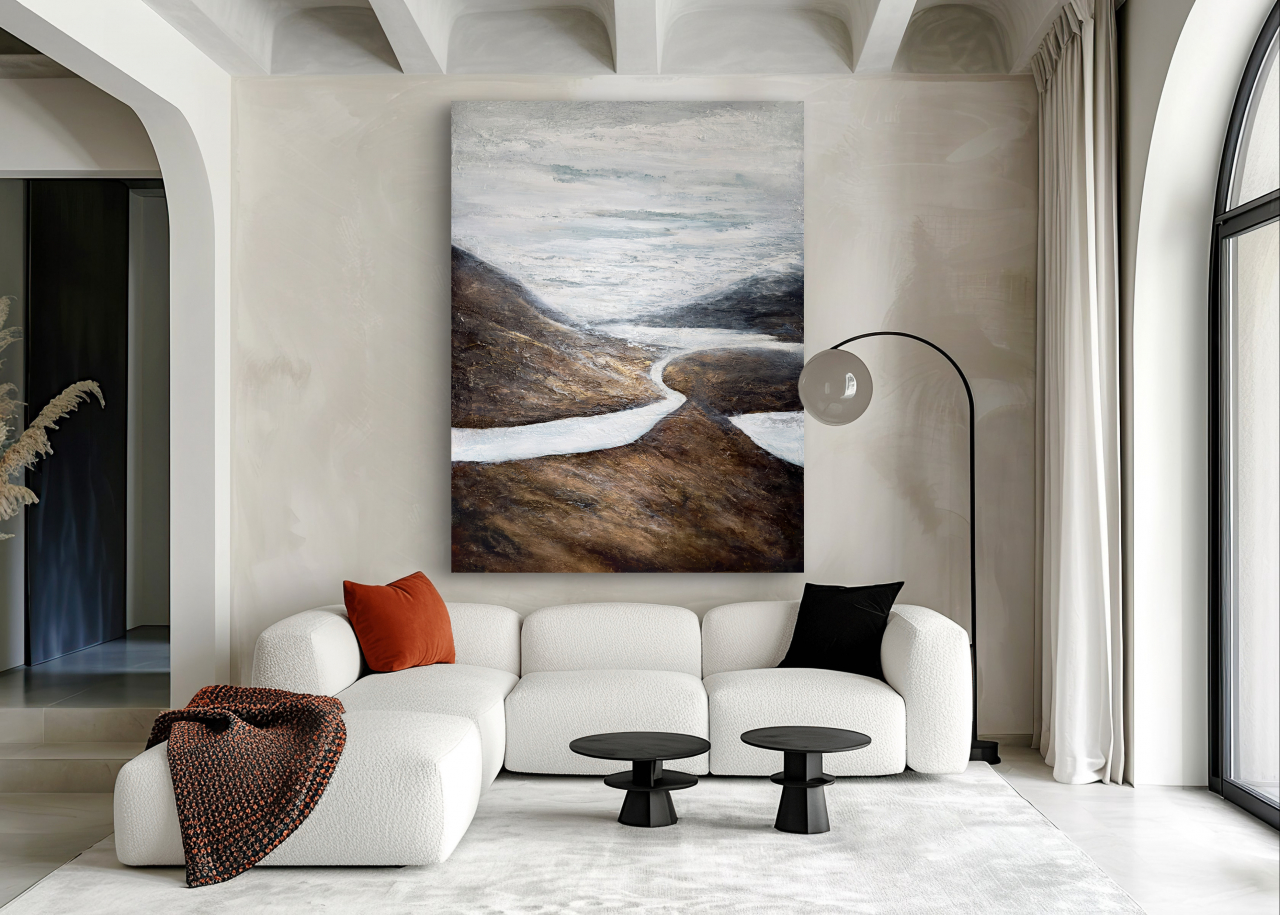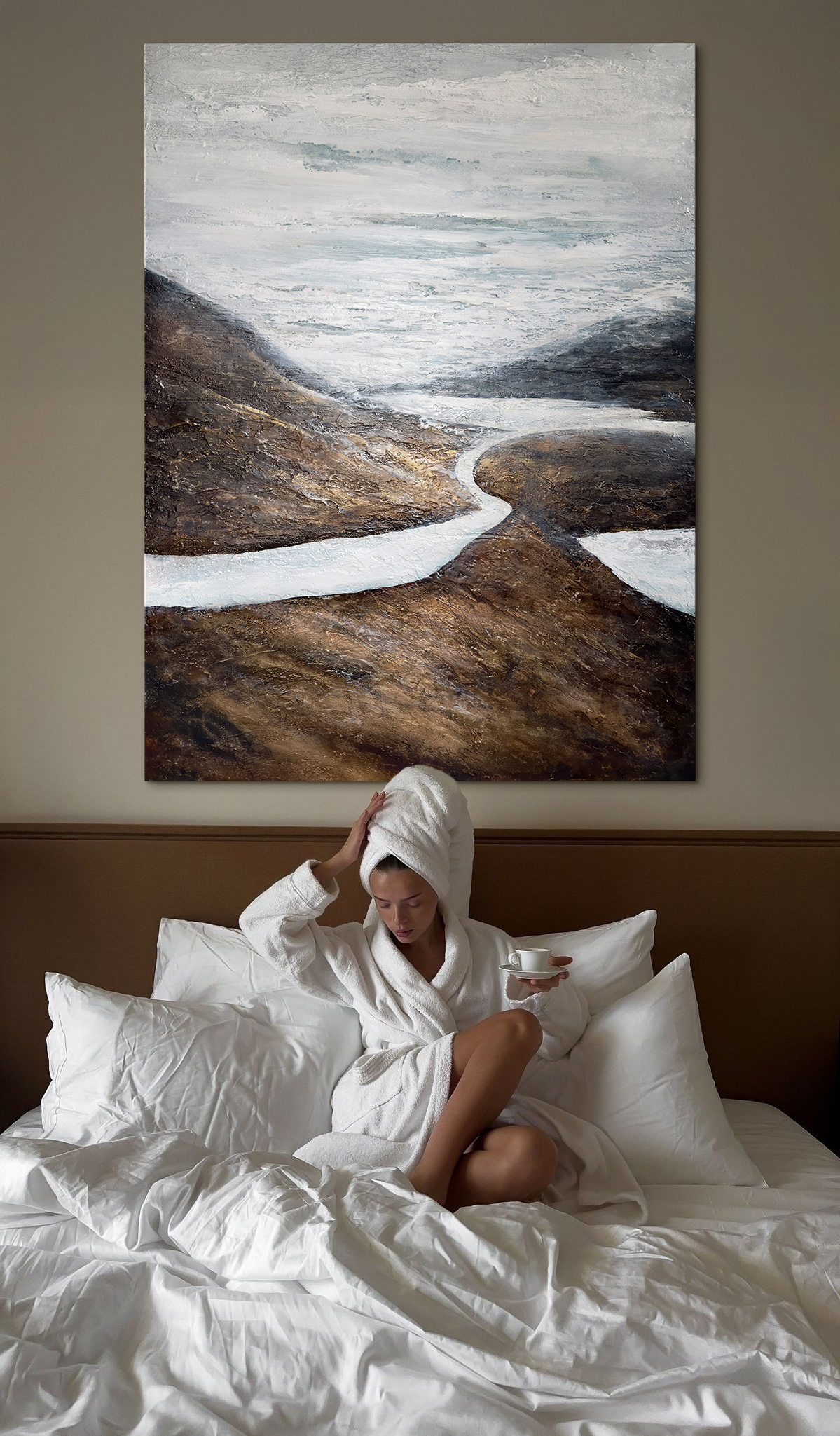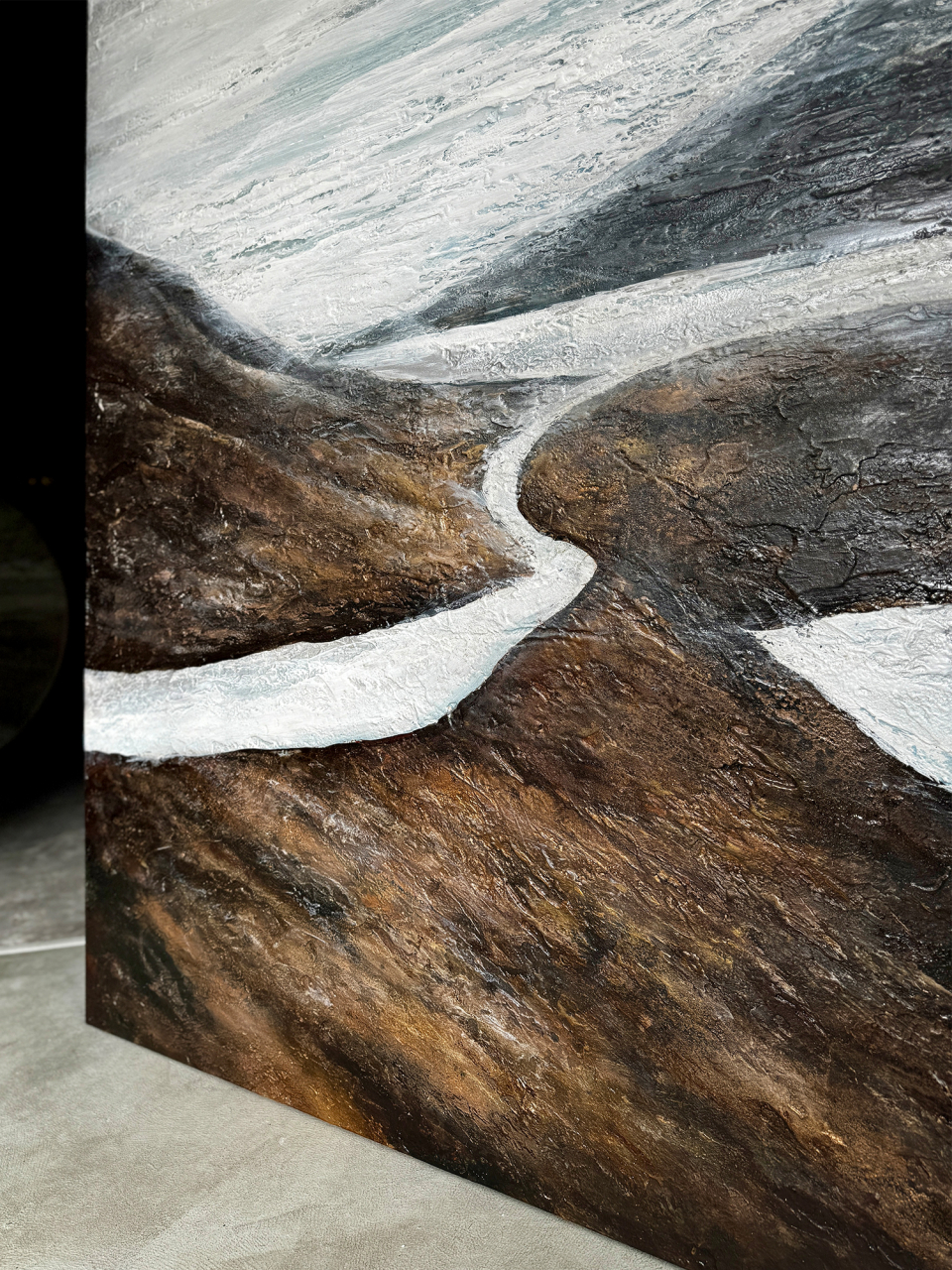 Горные массивы, поднятые словно из древней памяти Земли, работают как резонаторы: их форма создаёт ощущение глубинного баса, того самого тона, который человек не слышит ушами, но чувствует позвоночником. Это природная архитектура устойчивости, редкая в эпоху цифровой линейности.Белая река, извивающаяся зигзагом, становится линией движения, которая напоминает: путь живого никогда не прям. Белизна её — очищенная энергия потока, чистый импульс обновления. Река соединяет горы с небом, создавая внутри зрителя эффект дыхания: естественного, свободного, возвращённого.Светлое небо раскрывает пространство, будто стирая внутренние потолки, к которым привык городской человек. Оно наполнено спокойной, не страшной тишиной, которая поддерживает.