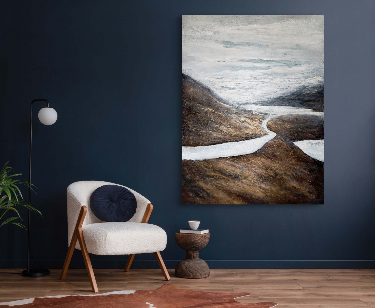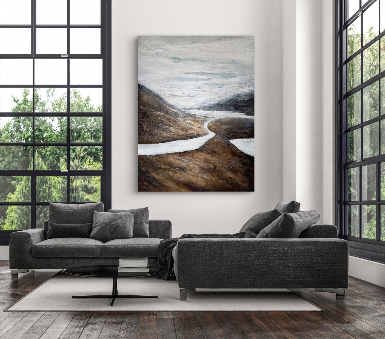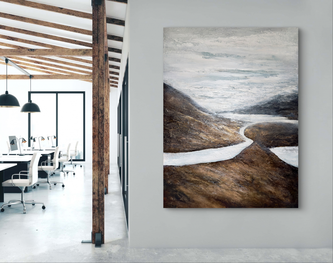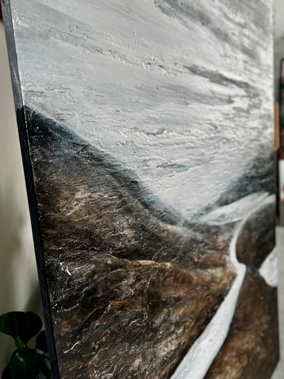 Горные массивы, поднятые словно из древней памяти Земли, работают как резонаторы: их форма создаёт ощущение глубинного баса, того самого тона, который человек не слышит ушами, но чувствует позвоночником. Это природная архитектура устойчивости, редкая в эпоху цифровой линейности.Белая река, извивающаяся зигзагом, становится линией движения, которая напоминает: путь живого никогда не прям. Белизна её — очищенная энергия потока, чистый импульс обновления. Река соединяет горы с небом, создавая внутри зрителя эффект дыхания: естественного, свободного, возвращённого.Светлое небо раскрывает пространство, будто стирая внутренние потолки, к которым привык городской человек. Оно наполнено спокойной, не страшной тишиной, которая поддерживает.