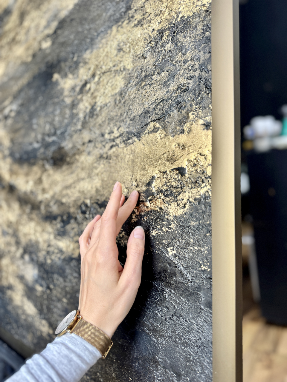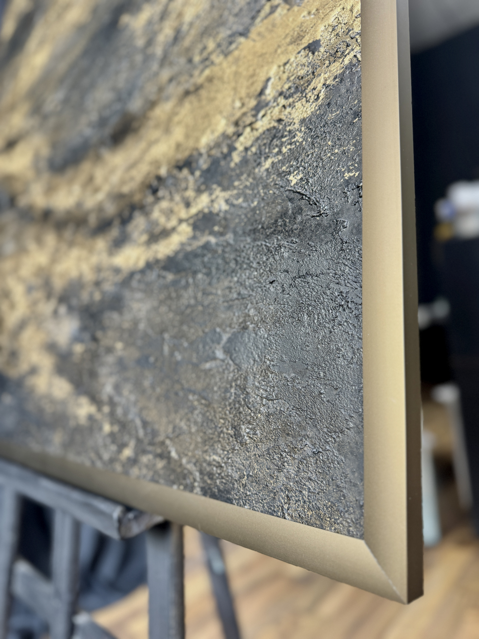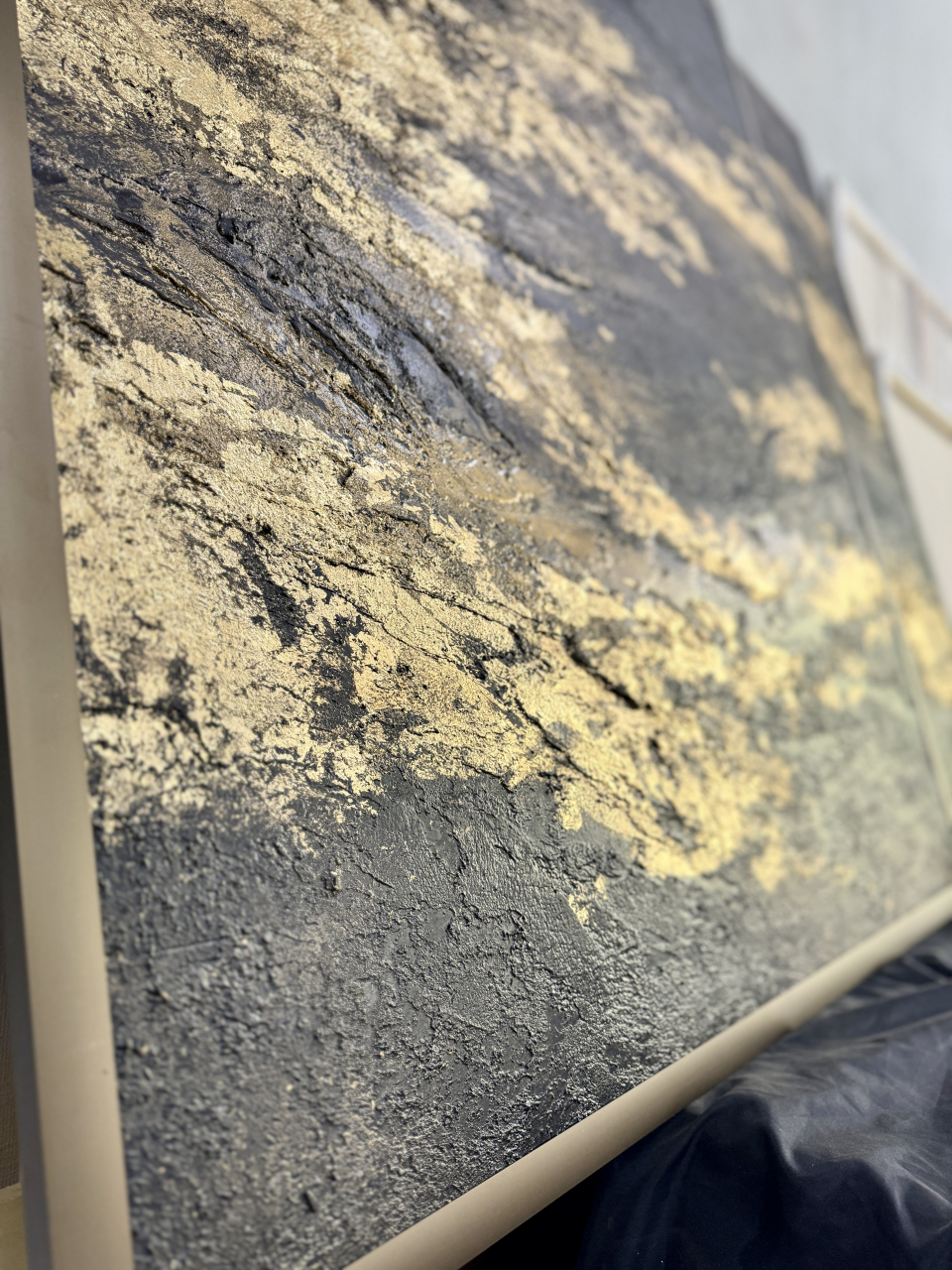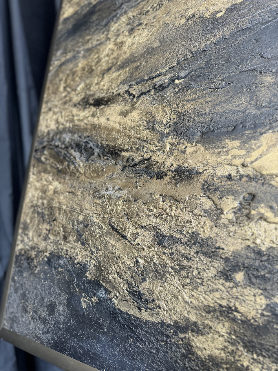 На грубой, живой, глубокой фактуре — будто бархат тьмы,распластаны золотые линии — как следы того,что однажды было движением, а теперь стало памятью.