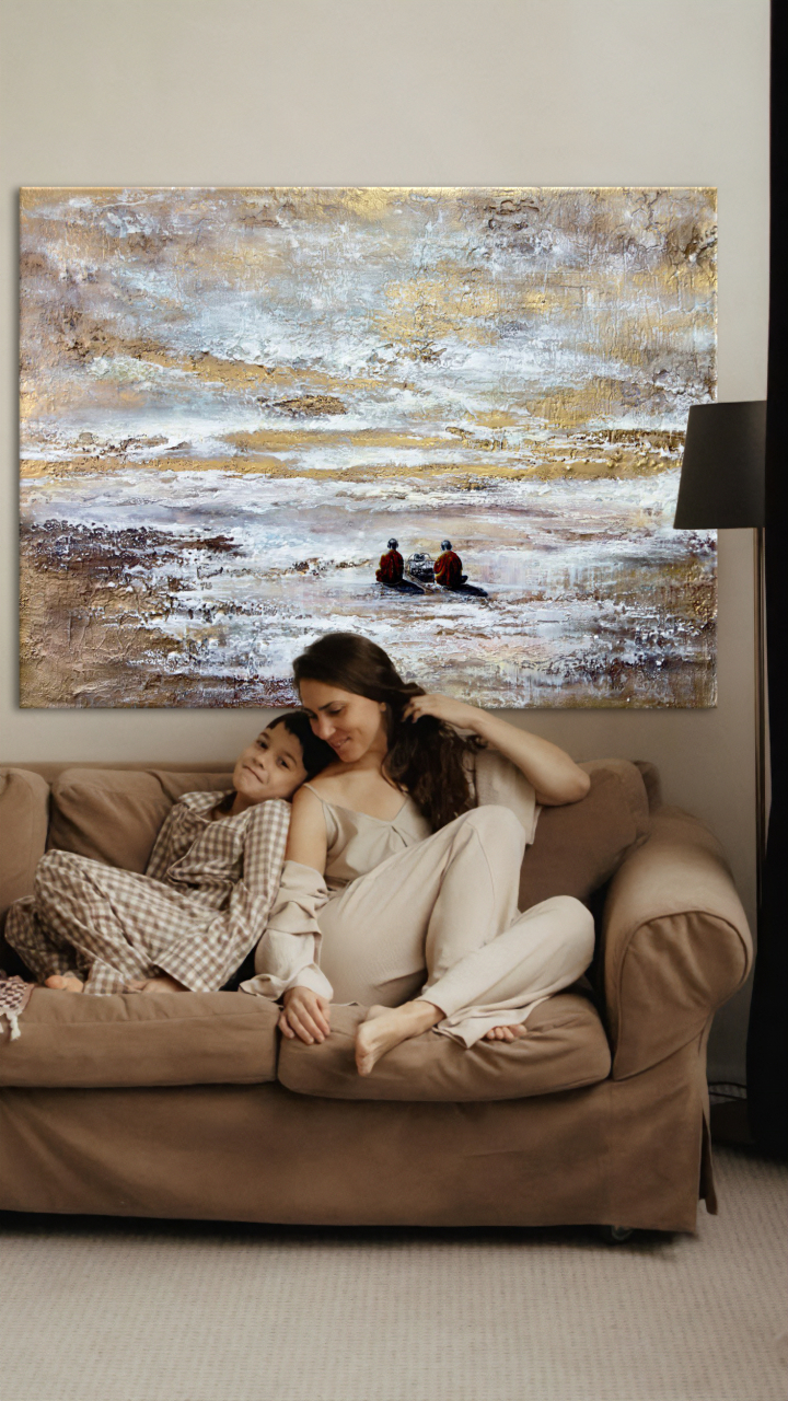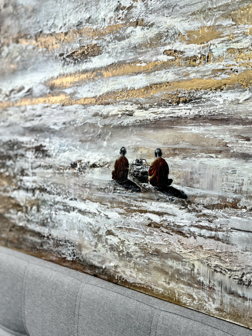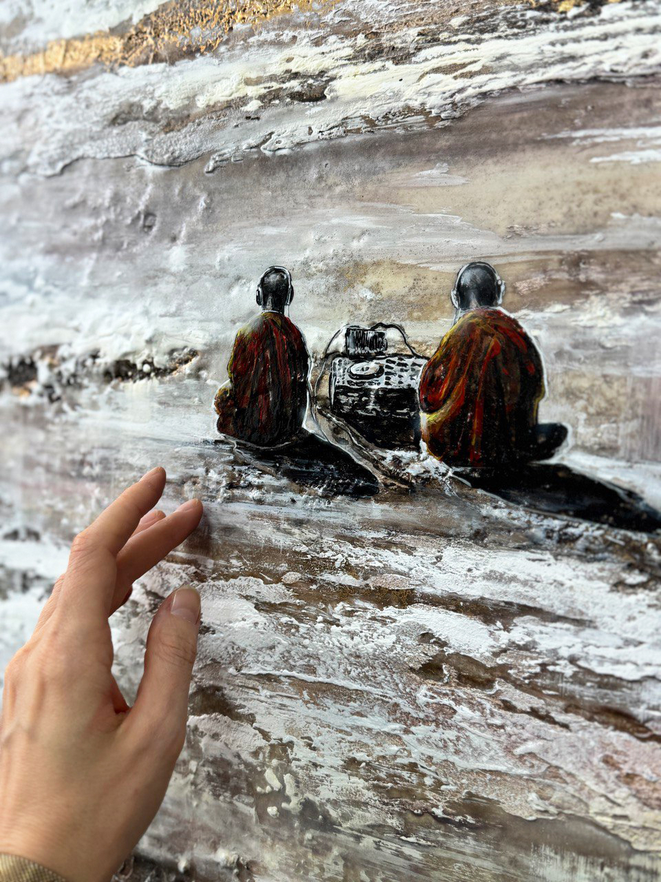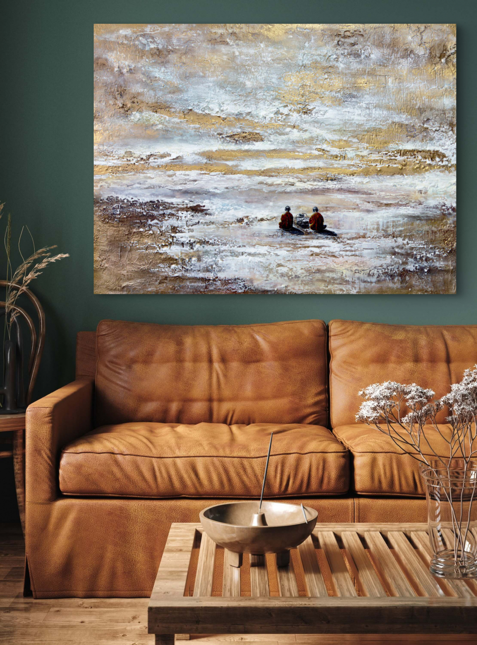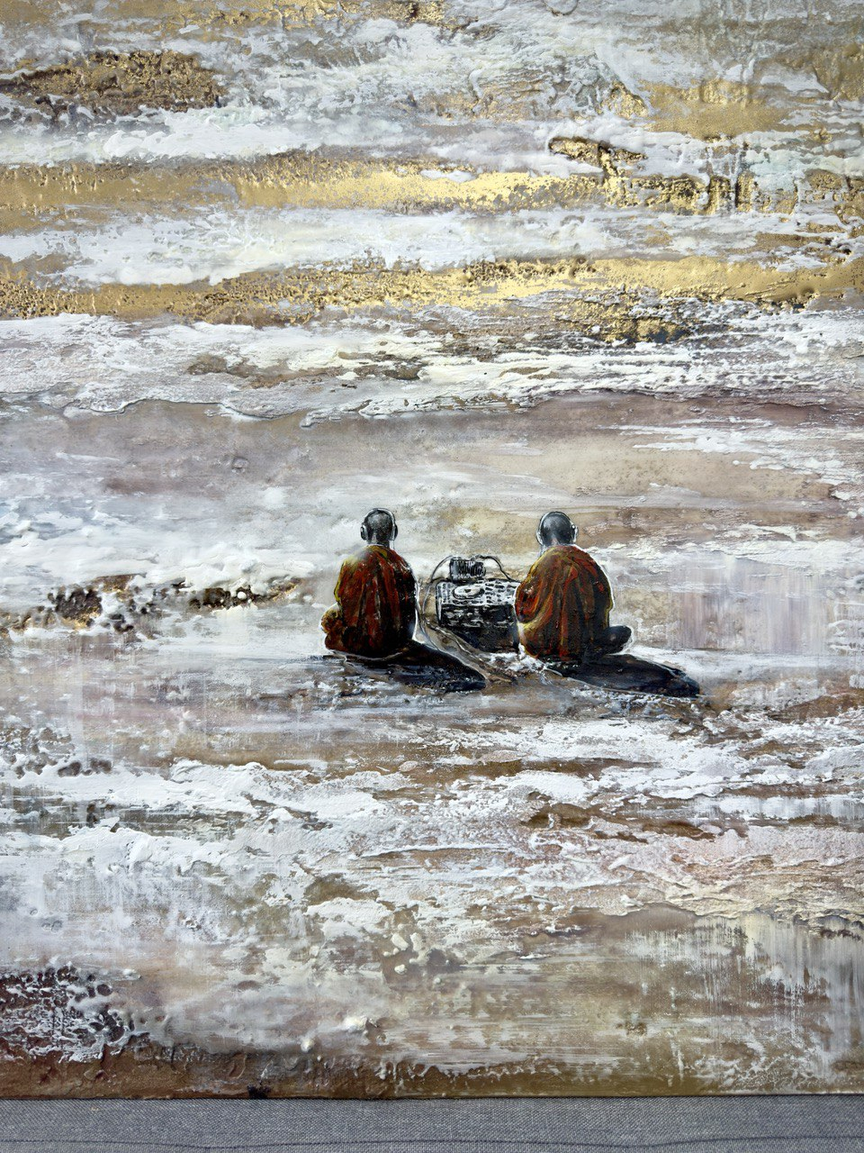 • Два монаха в оранжевых одеяниях — воплощение духовного сосредоточения и древней мудрости. Они отвернулись от зрителя, погруженные в звук, растворенные в мире, где нет ни прошлого, ни будущего, а есть лишь бесконечный «сейчас». Их поза выражает гармонию внутреннего и внешнего, баланс между телом и сознанием.
