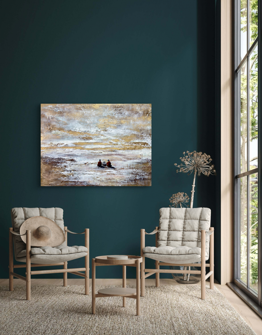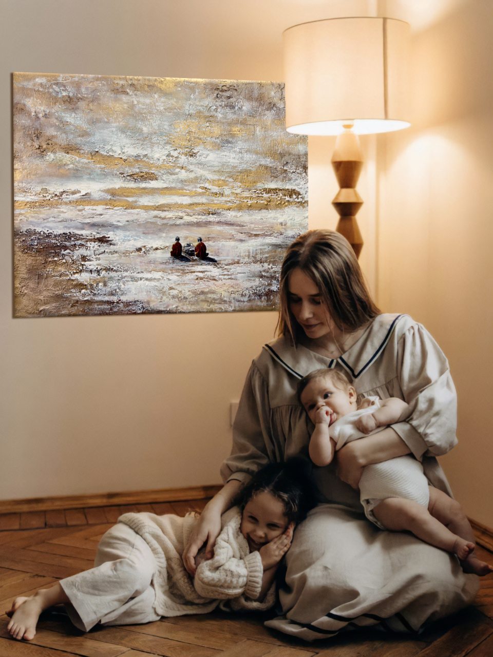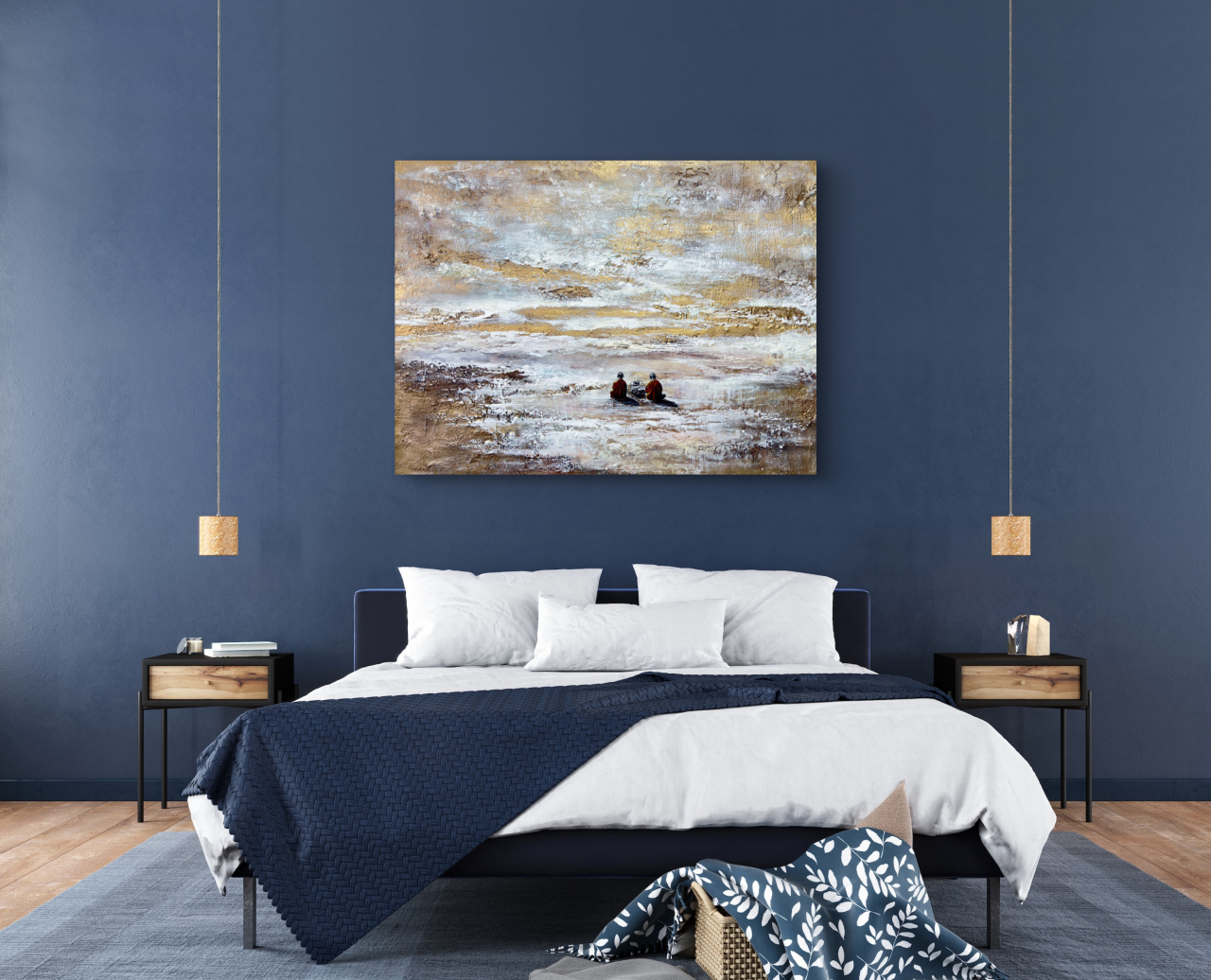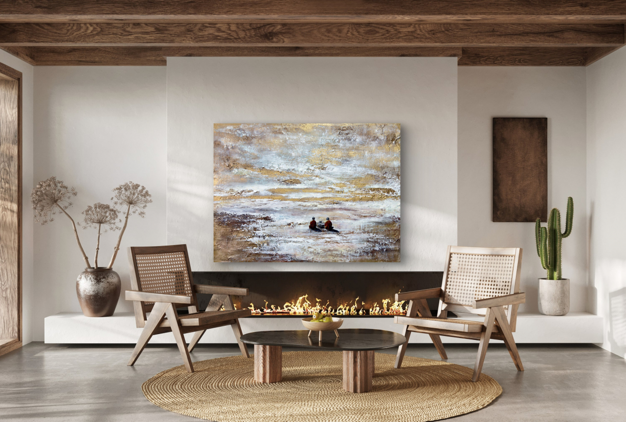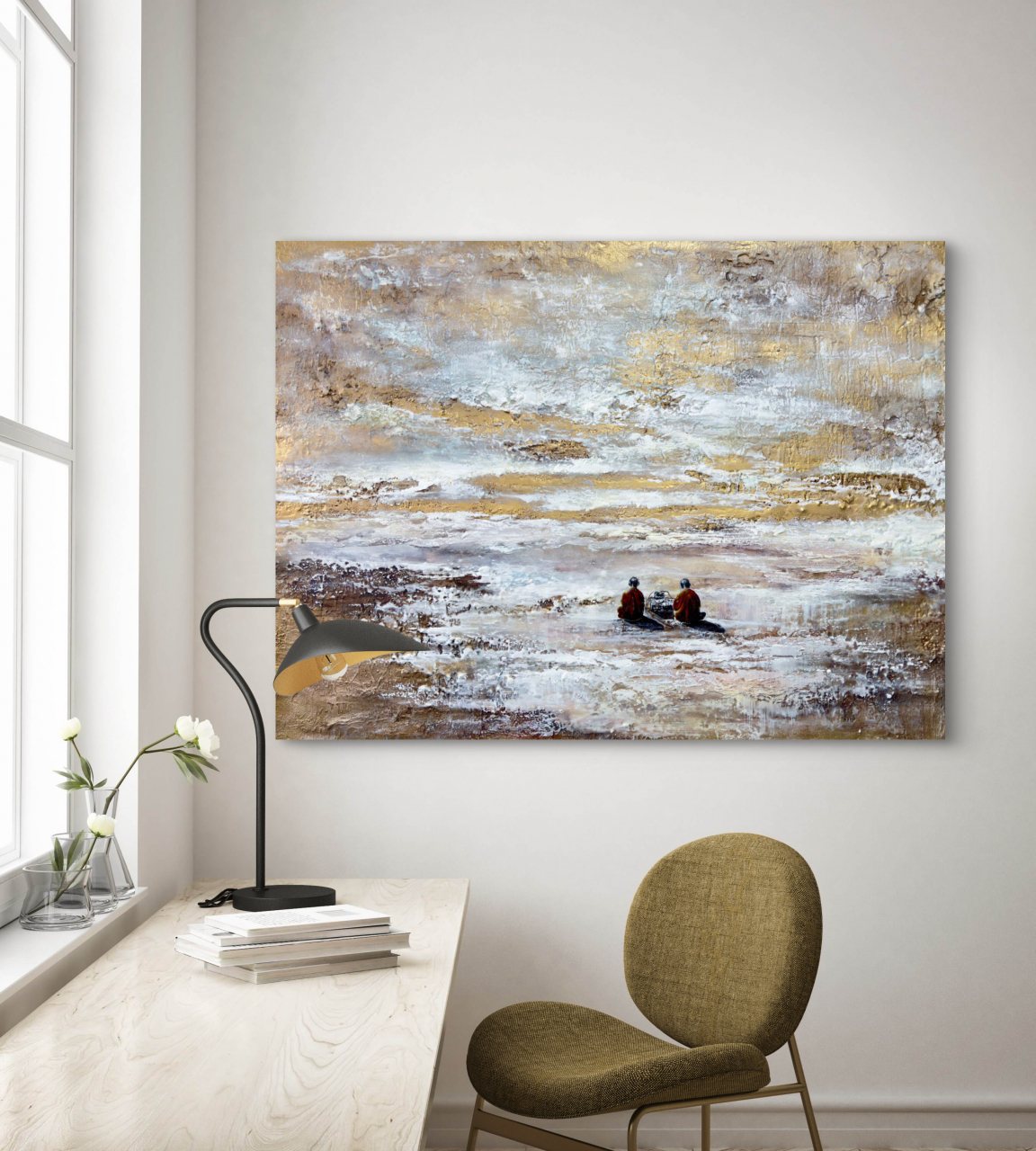 • Два монаха в оранжевых одеяниях — воплощение духовного сосредоточения и древней мудрости. Они отвернулись от зрителя, погруженные в звук, растворенные в мире, где нет ни прошлого, ни будущего, а есть лишь бесконечный «сейчас». Их поза выражает гармонию внутреннего и внешнего, баланс между телом и сознанием.