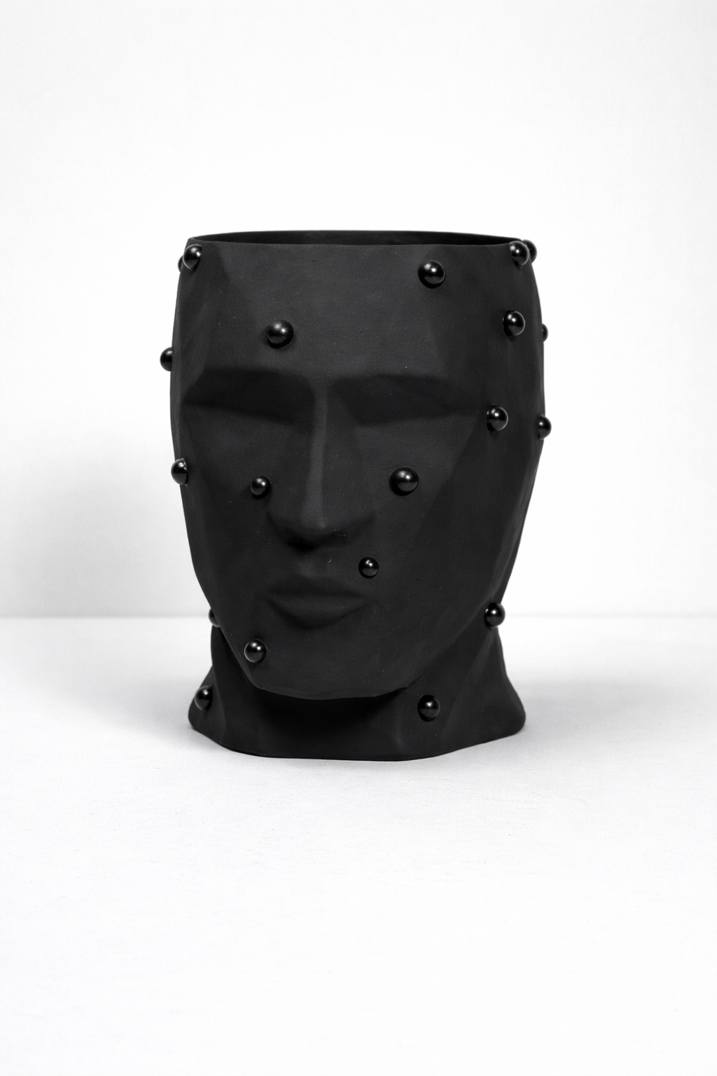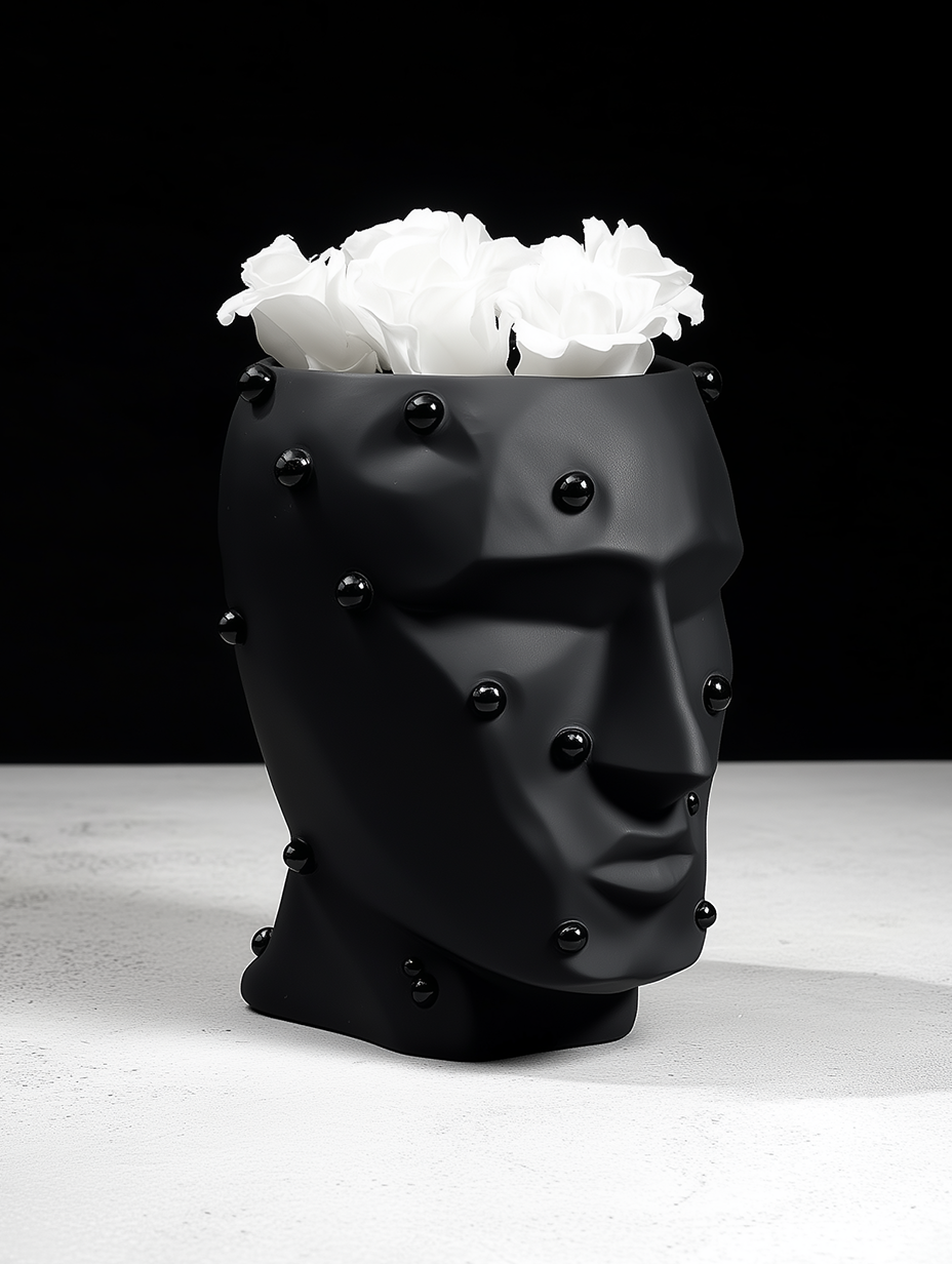 Матовая чёрная керамика подчёркивает выразительность линий и игру света на поверхности. Декоративные сферические акценты добавляют фактурности и делают изделие особенно притягательным вблизи. Минималистичный, но характерный дизайн позволяет кашпо органично вписаться в современные интерьеры — от минимализма и лофта до арт-деко и концептуальных пространств.