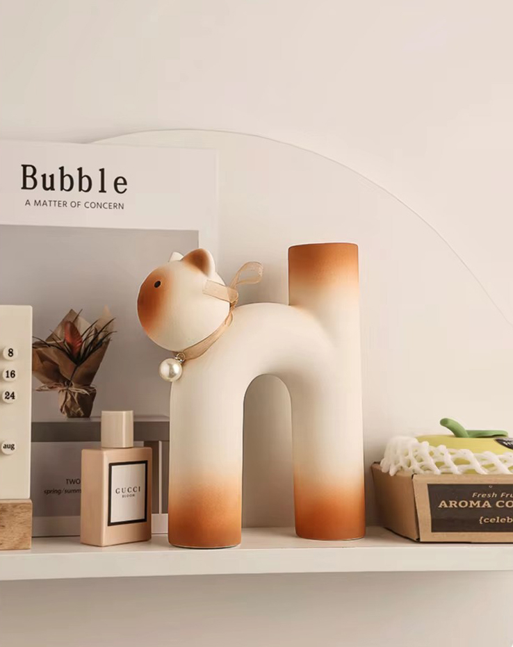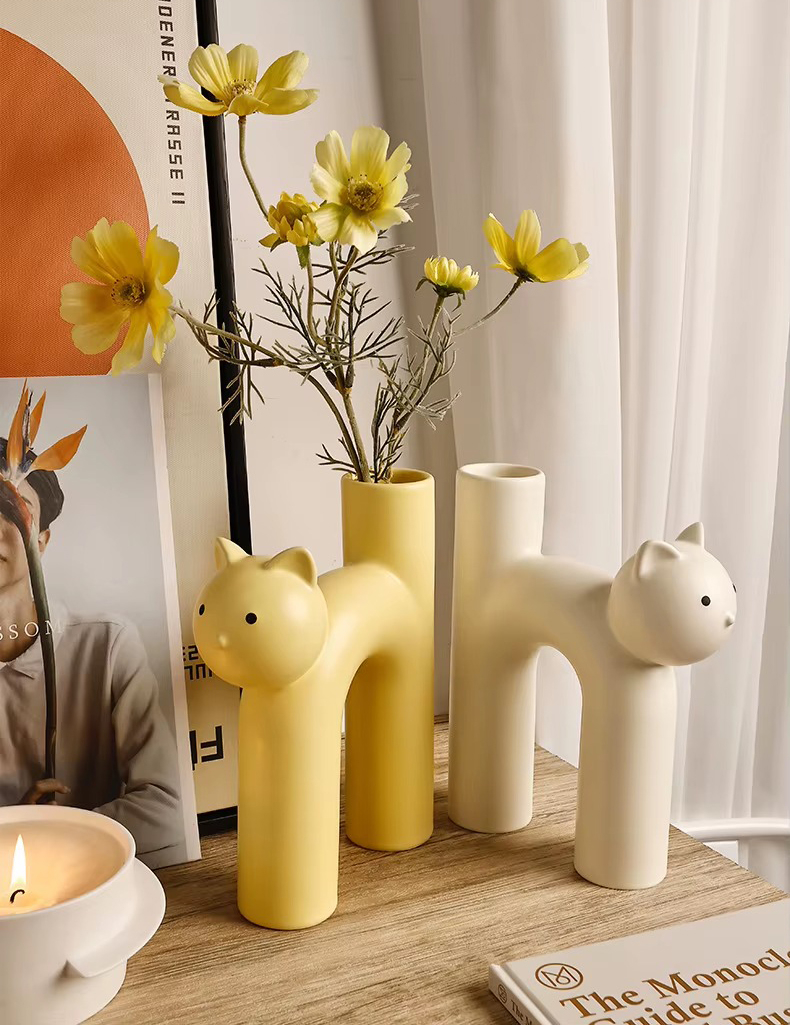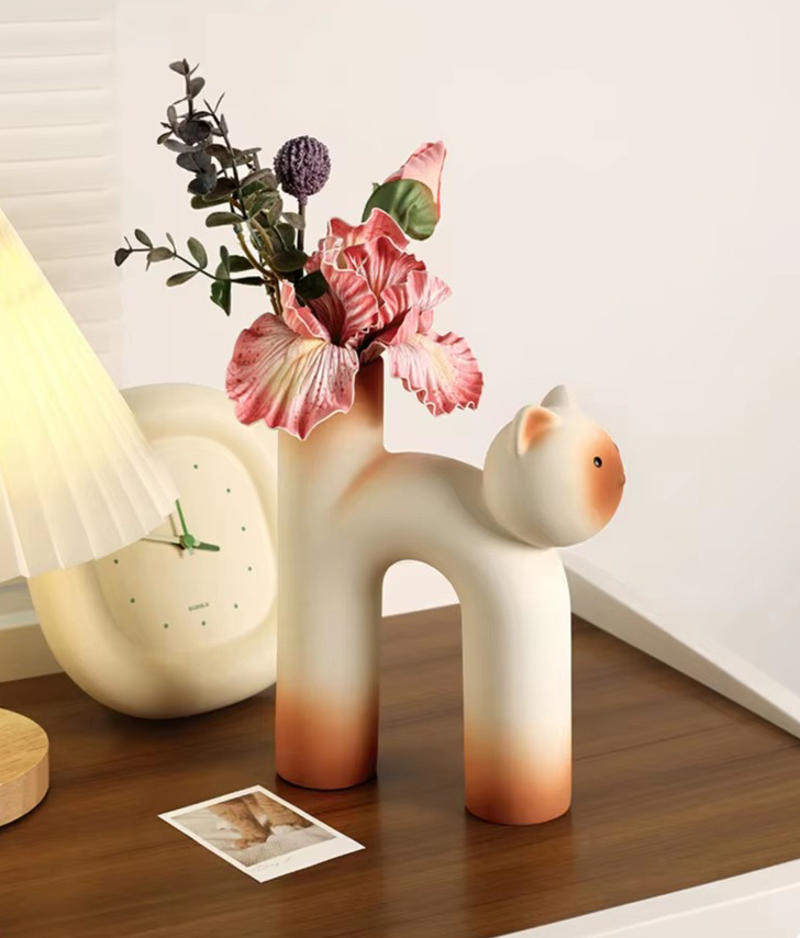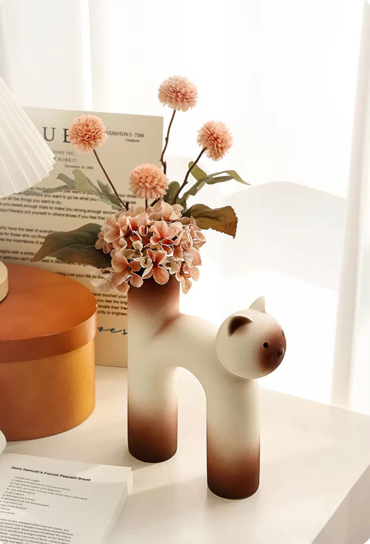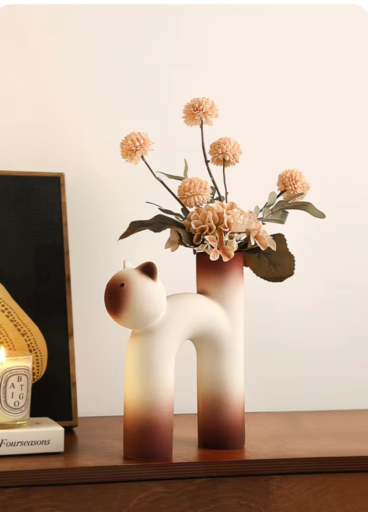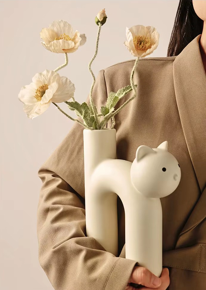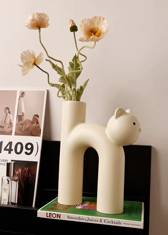Очаровательная керамическая ваза в форме котика — тёплый и забавный элемент декора. Плавные линии и лаконичная форма придают композиции уют и доброжелательность.