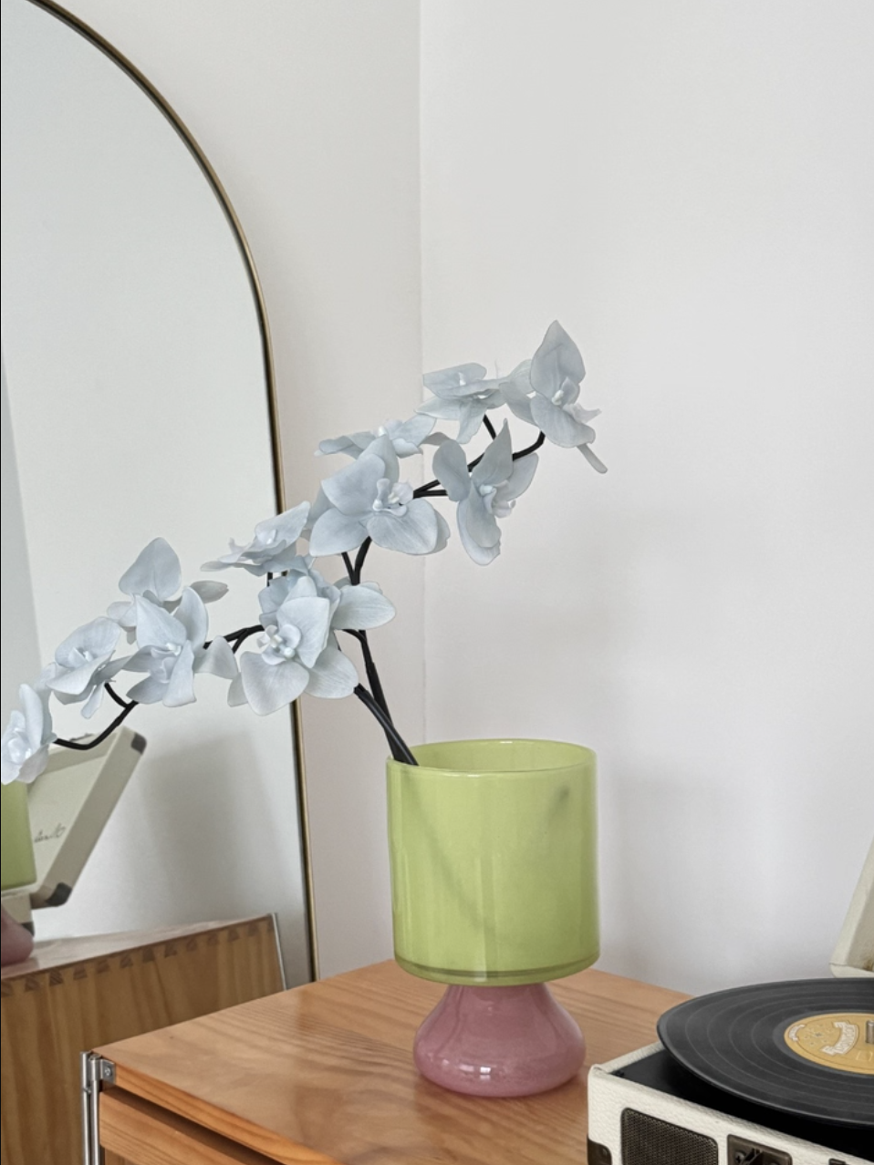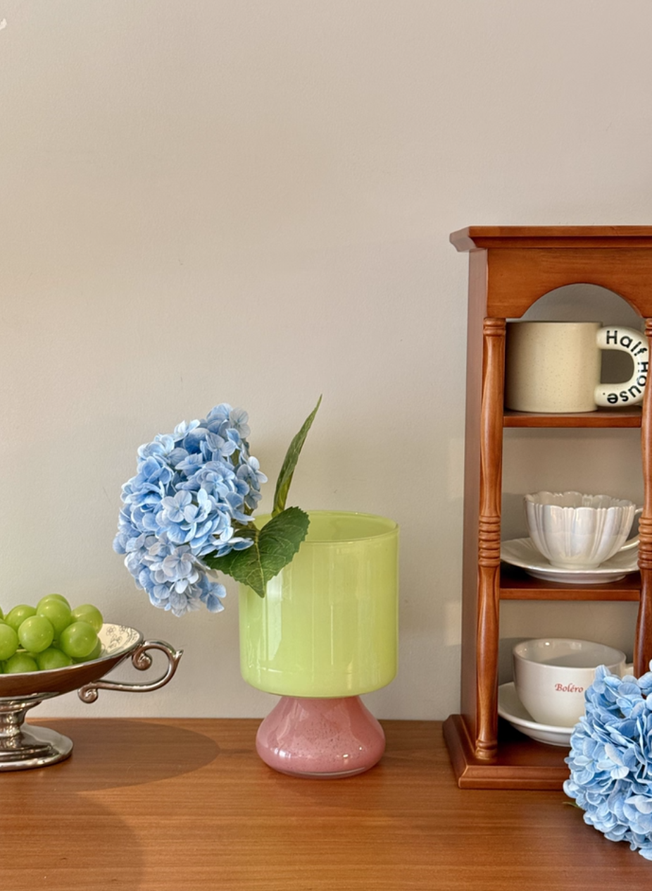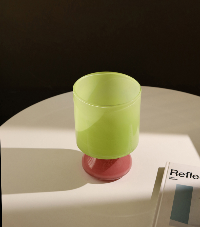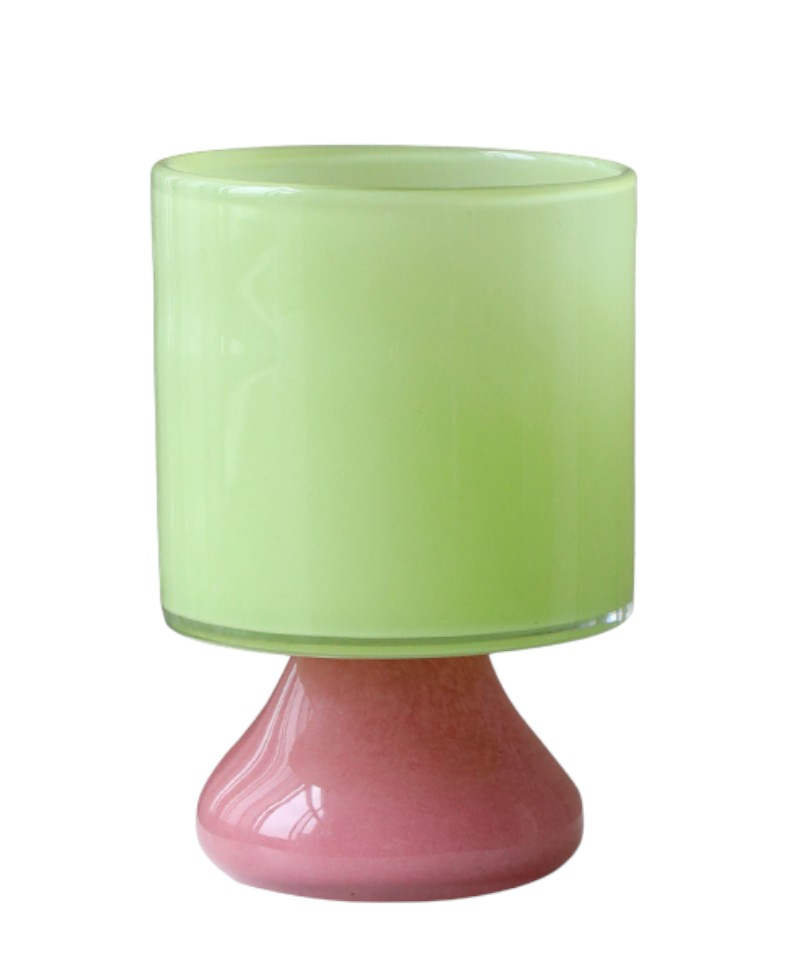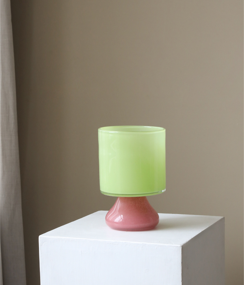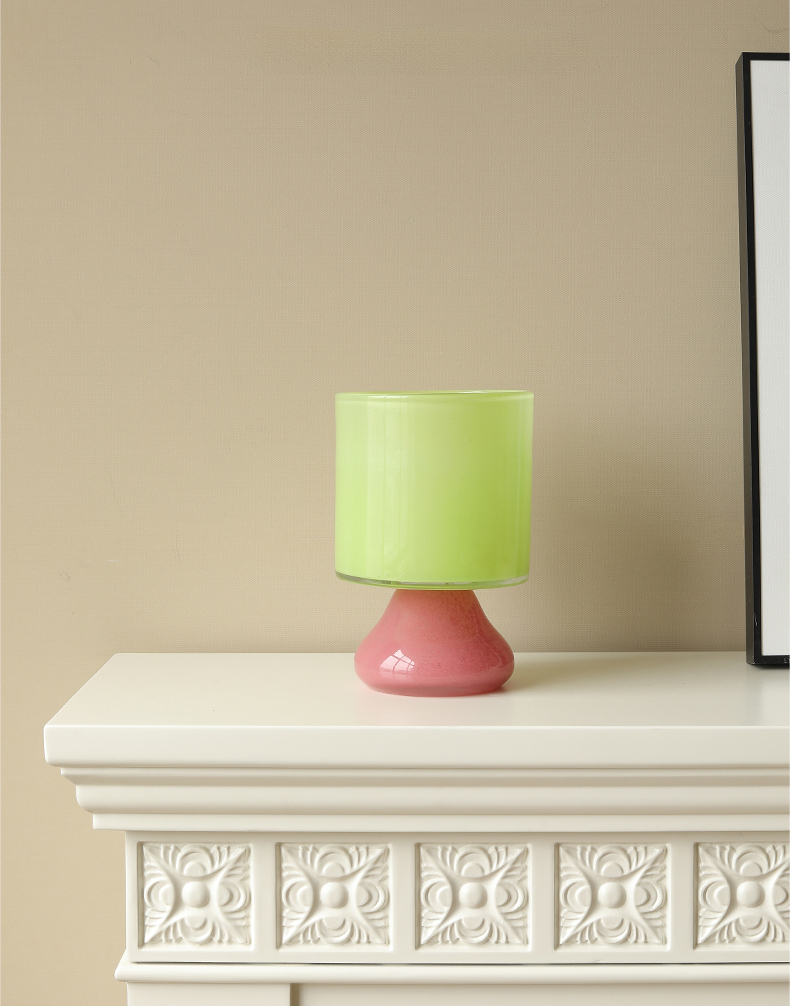Эта игривая стеклянная ваза напоминает миниатюрную настольную лампу и наполняет пространство радостью и светом. Сочетание мягкого зелёного и розового оттенков создаёт свежий, жизнерадостный акцент в интерьере. Идеальна для современных пространств, где ценят креативность и позитивное настроение.