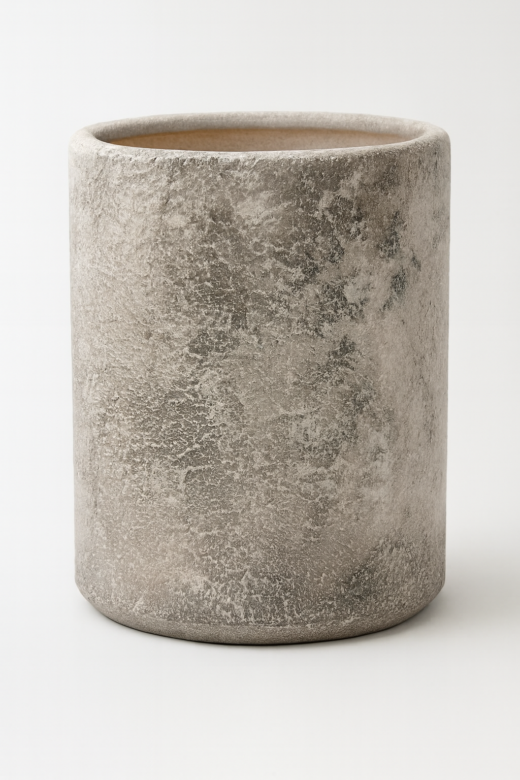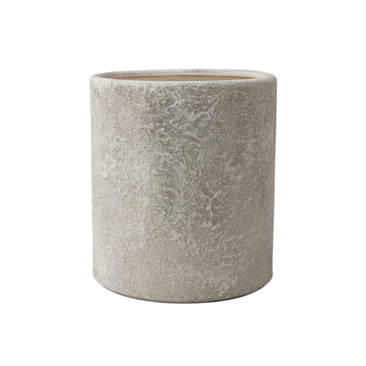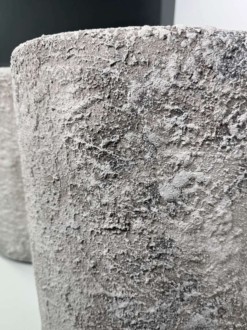 Лаконичный цилиндрический силуэт сочетается с живой, слегка шероховатой поверхностью, напоминающей натуральный камень или текстильную текстуру. Тёплый светло-бежевый оттенок создаёт ощущение уюта и спокойствия, наполняя пространство мягкой природной эстетикой.