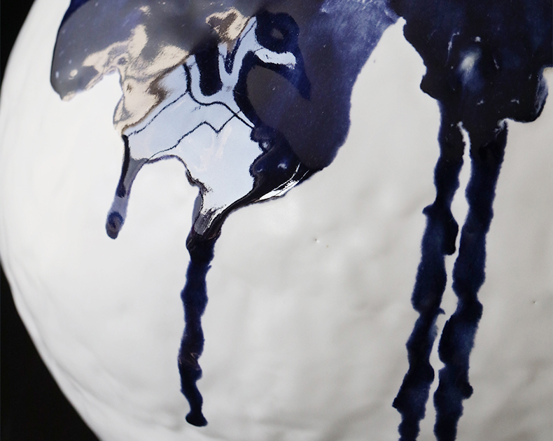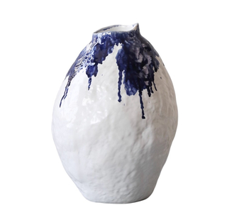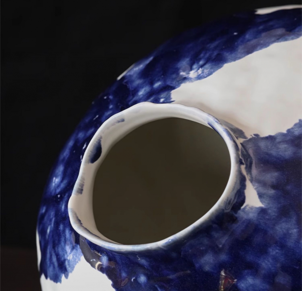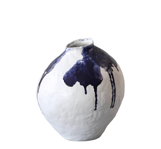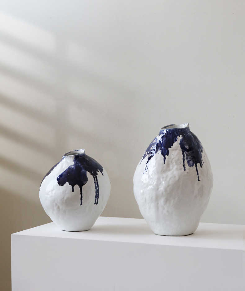 Эти керамические вазы словно несут отпечаток живого движения — глянцевая белая поверхность с глубокими синими потёками напоминает о свободе мазка художника. Их неровная форма и ручная текстура придают им особую чувственность и характер. Это предметы, в которых сочетаются простота материала и выразительность искусства.