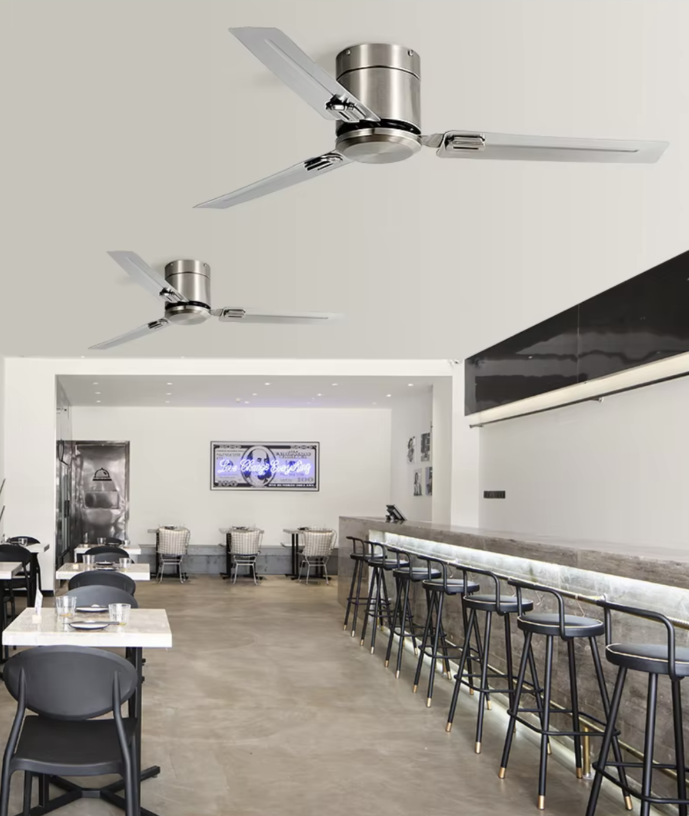 Минималистичный потолочный вентилятор с тремя прочными металлическими лопастями обеспечивает мощный и направленный поток воздуха. Стильный корпус в металлическом исполнении делает модель идеальной для современных интерьеров и коммерческих пространств. Доступны варианты управления: пульт дистанционного управления или настенный выключатель — выбирайте тот, который подходит вашему проекту.