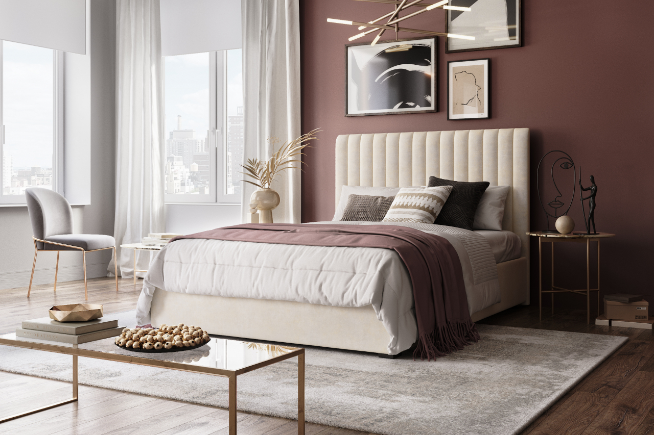 Элегантная кровать с выразительным геометрическим изголовьем станет акцентом спальни и добавит интерьеру индивидуальности. Мягкое основание и тщательно проработанные пропорции создают ощущение комфорта и визуальной лёгкости, а лаконичный дизайн легко сочетается как с минимализмом, так и с современным классическим стилем.