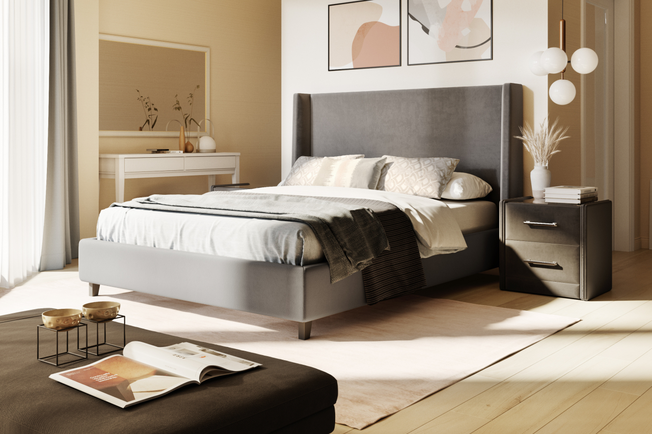 Элегантная кровать с выразительным геометрическим изголовьем станет акцентом спальни и добавит интерьеру индивидуальности. Мягкое основание и тщательно проработанные пропорции создают ощущение комфорта и визуальной лёгкости, а лаконичный дизайн легко сочетается как с минимализмом, так и с современным классическим стилем.