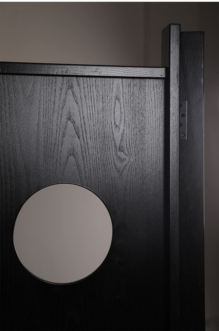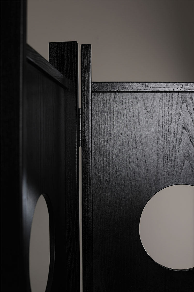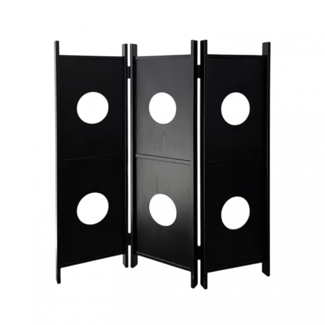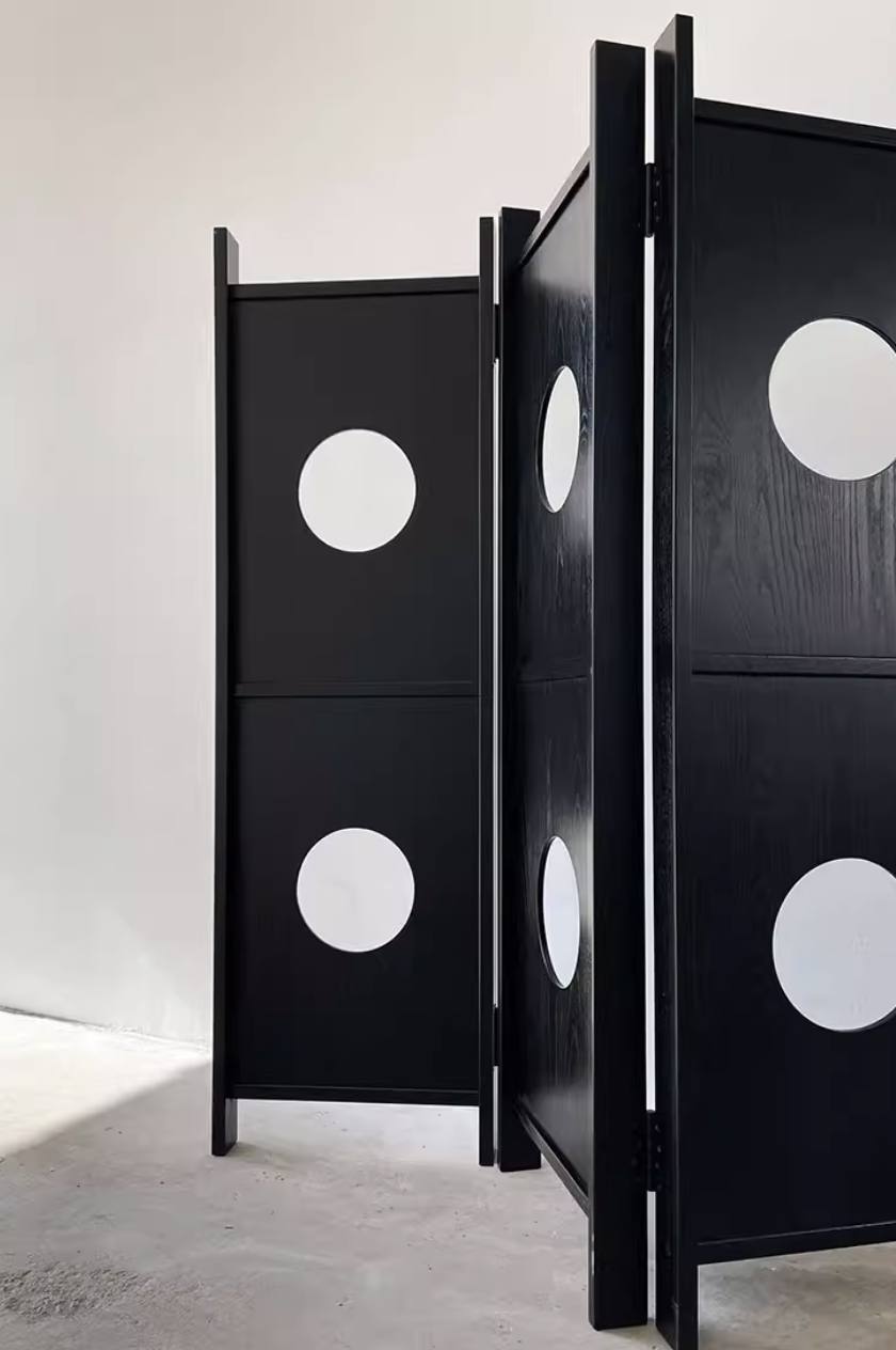 Чёткая геометрия панелей дополнена декоративными круглыми вставками, создающими ритм и визуальный баланс. Складная конструкция позволяет легко трансформировать пространство — отделить рабочую зону, спальню, гардеробную или создать приватный уголок в большом помещении.