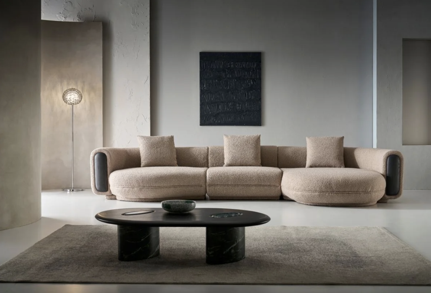 Акцентные подлокотники добавляют графичности и подчёркивают архитектуру дивана, создавая выразительный контраст фактур. Модель идеально подойдёт для просторных гостиных и лаунж-зон, органично вписываясь в интерьеры в стиле modern, soft luxury и contemporary.