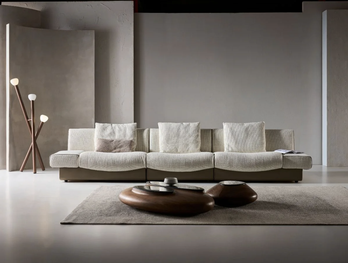 Сиденья выполнены в мягкой текстильной обивке, обеспечивающей комфорт и уют при ежедневном использовании. Подножки и нижняя часть дивана облицованы шорно-седельной кожей — прочным и выразительным материалом, который подчёркивает архитектуру формы и добавляет модели премиальный характер. Контраст фактур создаёт эффектный визуальный баланс и делает диван особенно выразительным в интерьере.