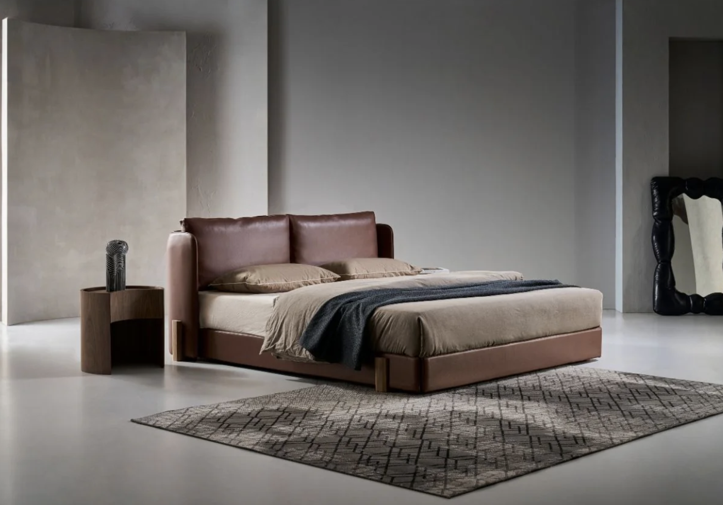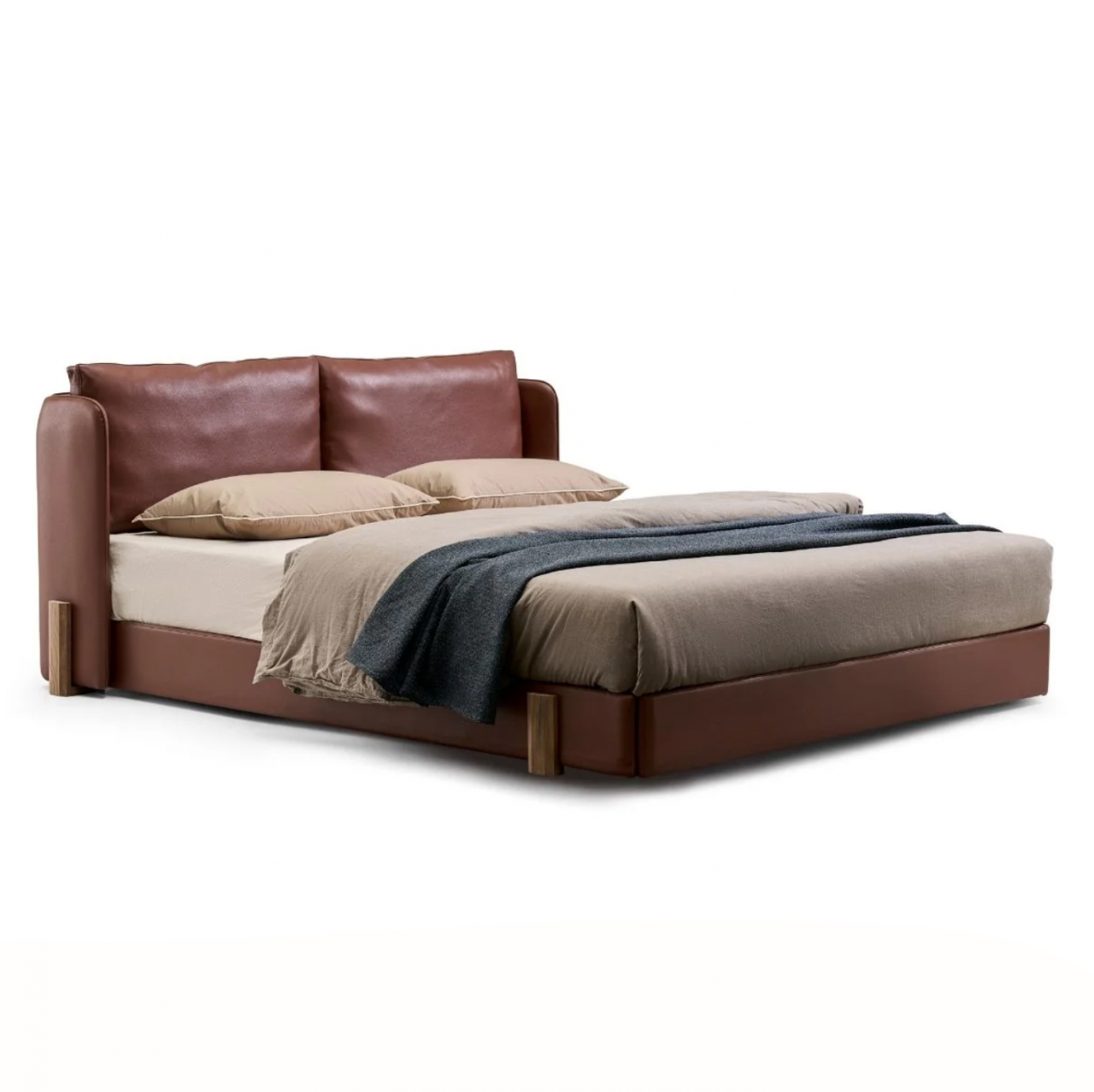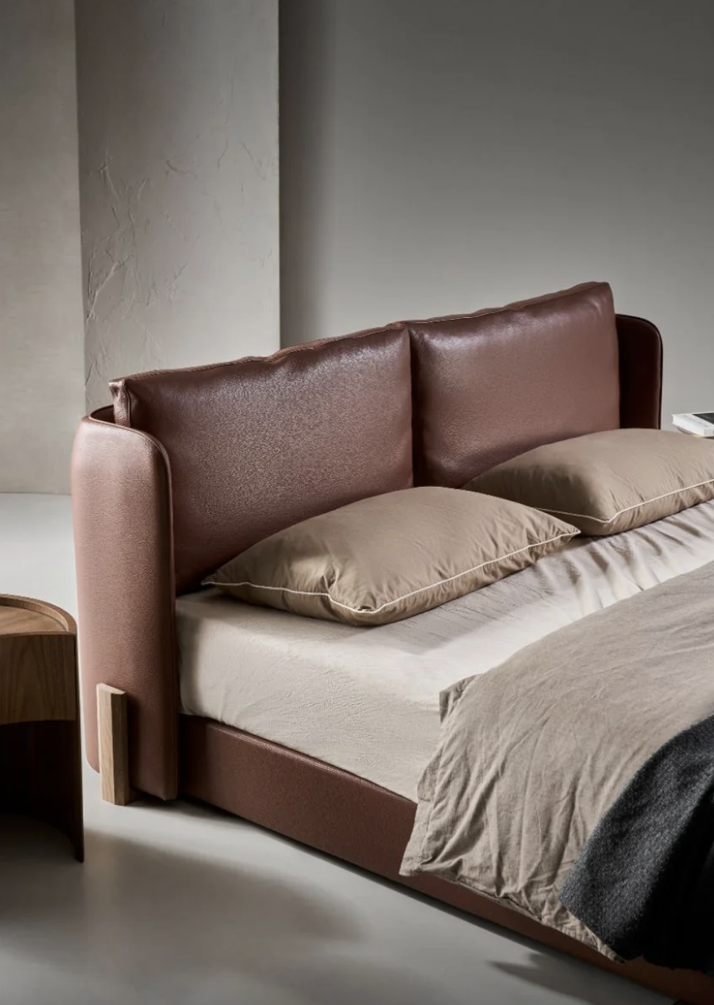 Объемные подушки изголовья обеспечивают удобную опору для отдыха и чтения, а обивка из кожи добавляет интерьеру тепла и статусности. Низкий корпус и лаконичные формы создают ощущение спокойствия и уюта. Идеальный выбор для современной спальни.
