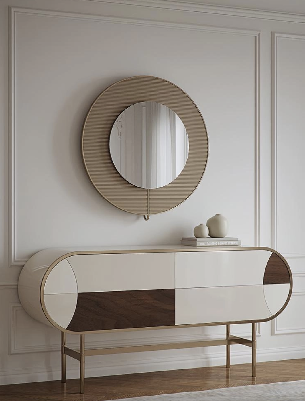 Фасады сочетают глянцевые панели и текстуру натурального дерева, придавая изделию глубину и характер. Изящное основание с металлическими элементами и латунным покрытием добавляет легкости и винтажного шарма, отсылая к эстетике середины XX века.