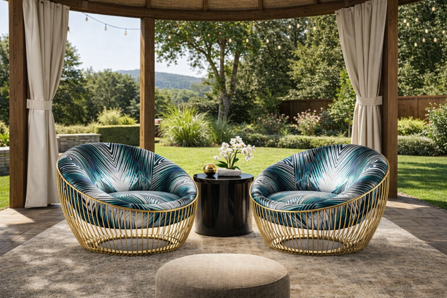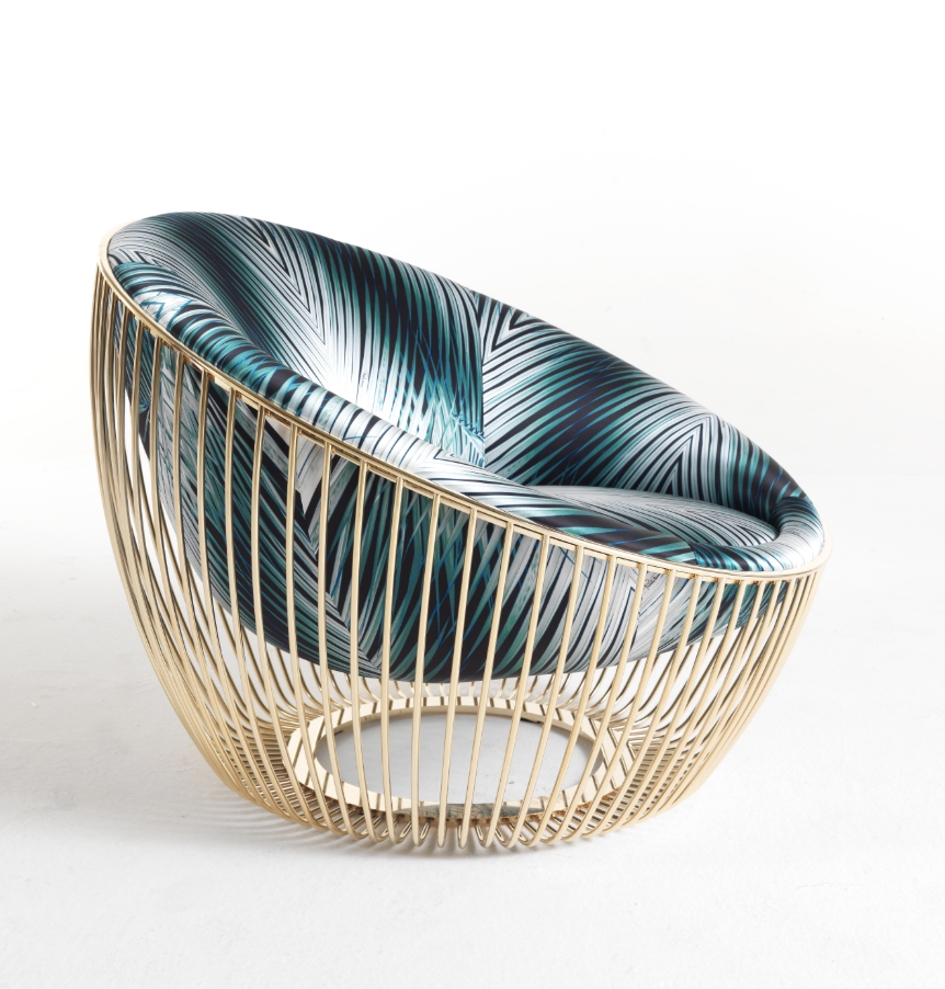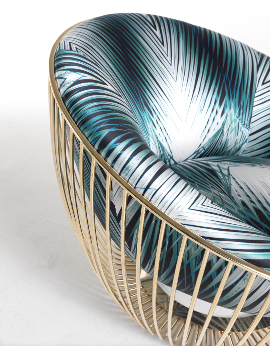 Округлая форма сиденья создаёт комфортную, обволакивающую посадку, располагающую к отдыху. Графичный текстиль с динамичным узором формирует яркий визуальный эффект и придаёт модели индивидуальность. Каркас из тонких металлических прутьев с тёплым оттенком придаёт креслу воздушность и подчёркивает современный характер дизайна. Модель станет акцентным элементом интерьера гостиной, лаунж-зоны или дизайнерского пространства.