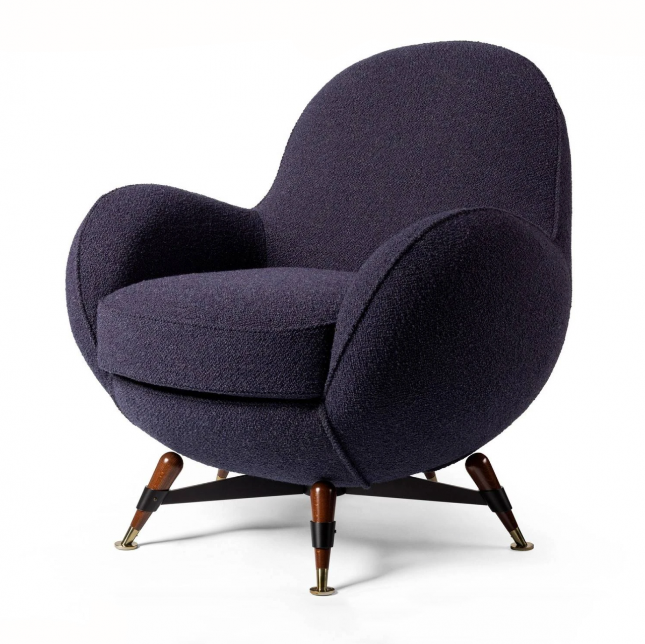 Лаконичное, но выразительное кресло‑акцент: мягкие, окутывающие формы словно обнимают, а фактурная темная обивка добавляет глубину и уют. Низкая посадка и удобная широкая подушка делают его отличным местом для вечернего чтения или отдыха, а ножки из дерева с металлическими наконечниками добавляют роскошный ретро‑штрих и визуальную легкость.