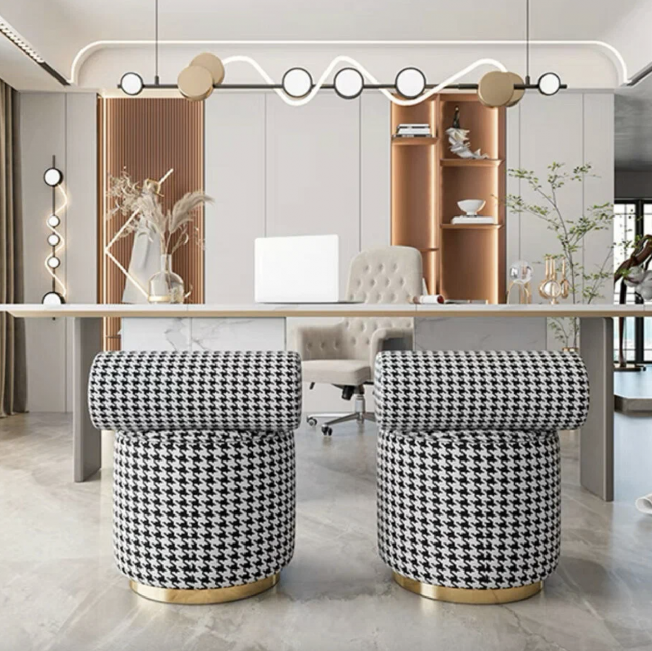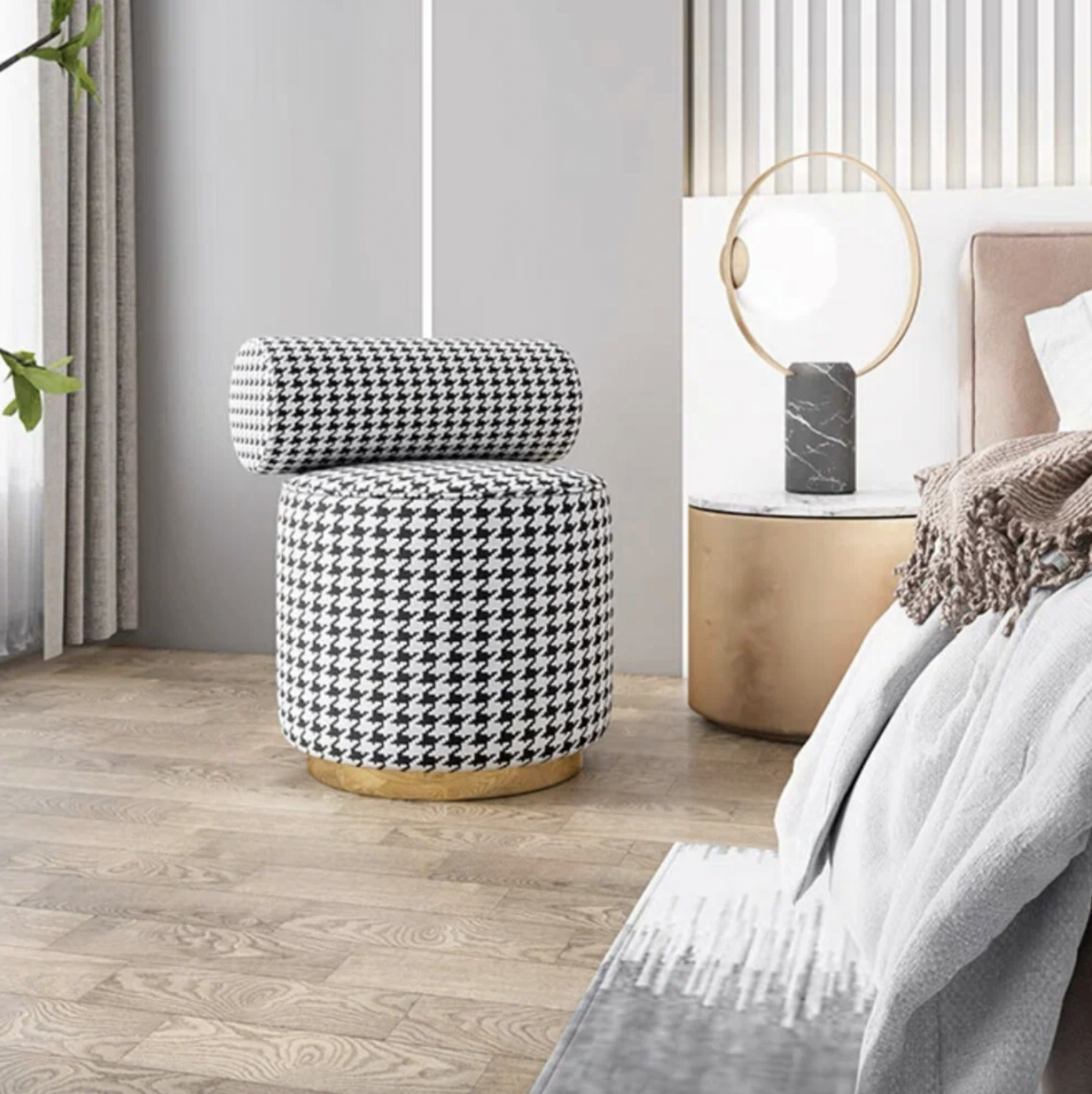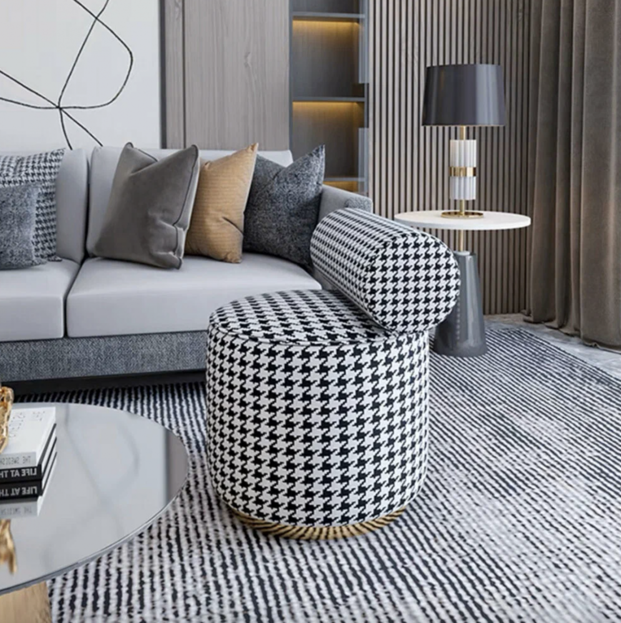 Стильный дизайнерский пуф с выразительным графическим узором — эффектное сочетание формы и текстуры. Обивка с классическим принтом «гусиная лапка» придаёт модели характер и визуальную динамику, а мягкая цилиндрическая спинка обеспечивает комфортную поддержку. Компактный размер делает пуф универсальным: он подойдёт для гостиной, спальни или зоны отдыха, легко дополняя интерьер в стиле modern, art-deco или mid-century. Отличный акцент, который сразу притягивает взгляд.
