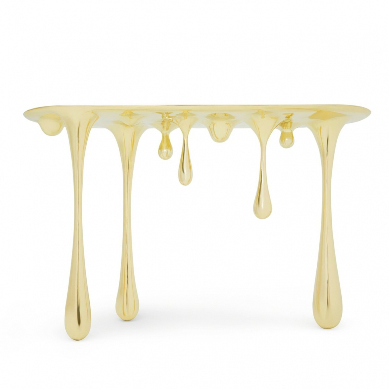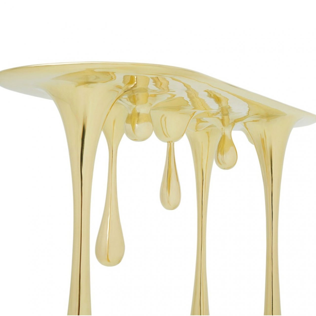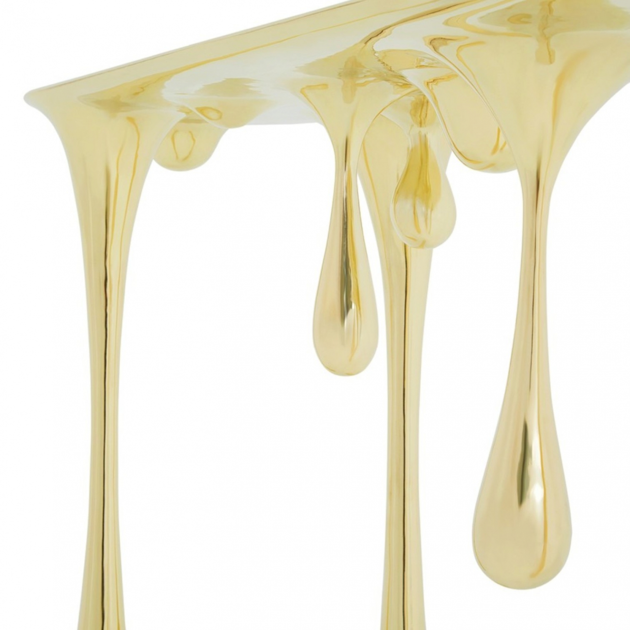 Изделие выполнено из стеклопластика, что обеспечивает прочность при визуальной воздушности, а гальваническое покрытие придаёт поверхности насыщенный зеркальный блеск с эффектом расплавленного золота. Такая консоль идеально впишется в современный интерьер, выступая как функциональный предмет и выразительный элемент дизайна.