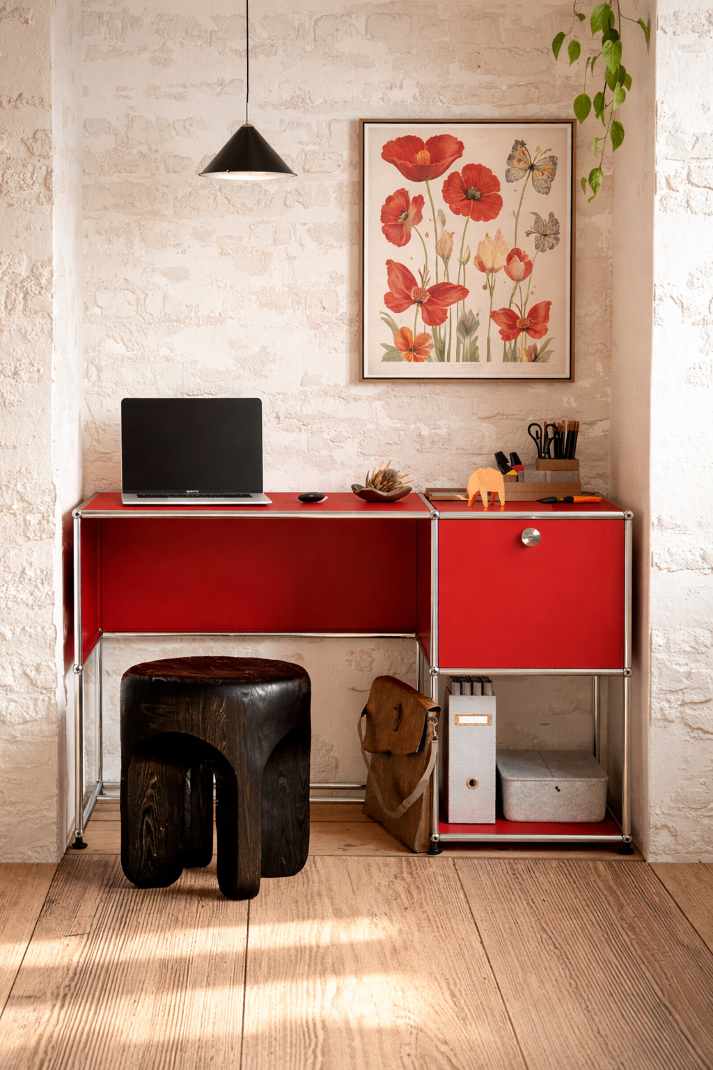 Контраст металла и ярких панелей добавляет интерьеру динамики и акцентности, делая стол идеальным решением для креативных пространств.