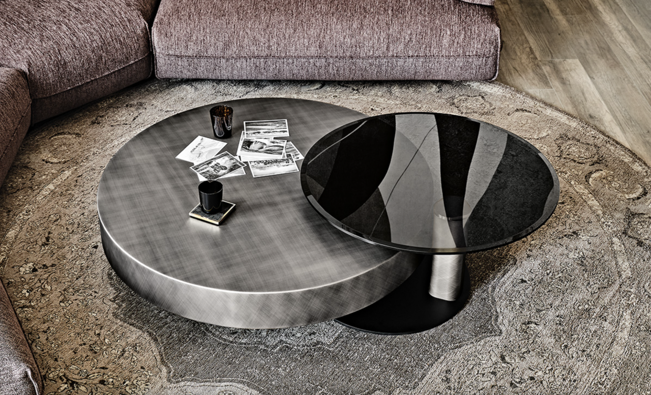 Стол с круглой столешницей и матовым металлическим покрытием на низком основании, дополненный компактным асимметричным столиком со стеклянной столешницей и цилиндрической опорой. Продуманная композиция сочетает элегантность и функциональность, создавая гармоничный ансамбль для гостиной. Четкие линии и контраст материалов подчеркивают лаконичную эстетику, а многоуровневая конструкция добавляет интерьеру динамики. Идеальное решение для ценителей аккуратного, стильного пространства с продуманными деталями.