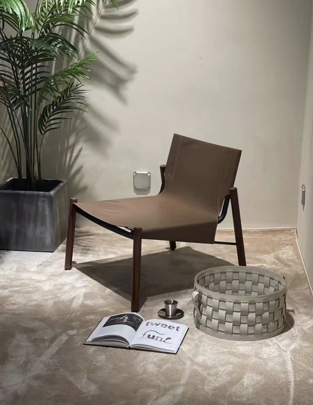 Лаунж-кресло с выразительным силуэтом и акцентом на натуральные материалы. Обивка выполнена из прочной шорно-седельной кожи, представленной в двух вариантах расцветок, что подчёркивает характер и благородство модели.