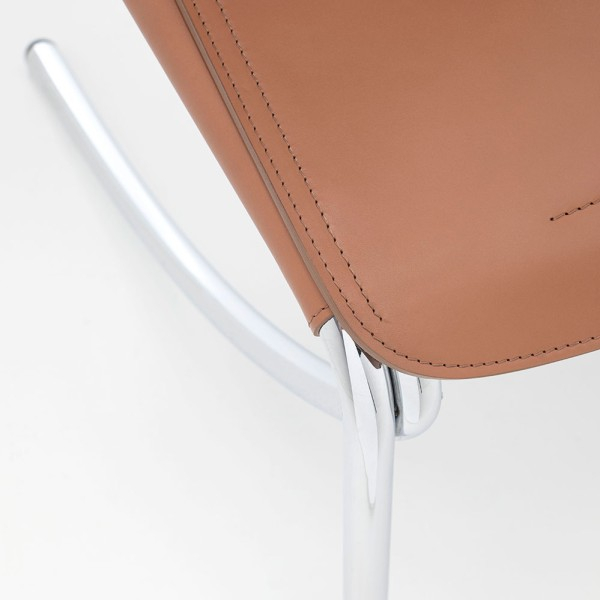 Элегантный стул, в котором минимализм встречается с комфортом. Мягкое сиденье и спинка выполнены из качественной плотной кожи тёплого карамельного оттенка — материал приятен на ощупь, устойчив к износу и легко очищается. Эргономичная форма повторяет контуры тела, обеспечивая удобную посадку даже при длительном использовании.Изящный хромированный каркас с плавными линиями придаёт стулу визуальную лёгкость и современный характер. Конструкция устойчива и прочна, а оригинальная форма ножек делает модель стильным акцентом интерьера.