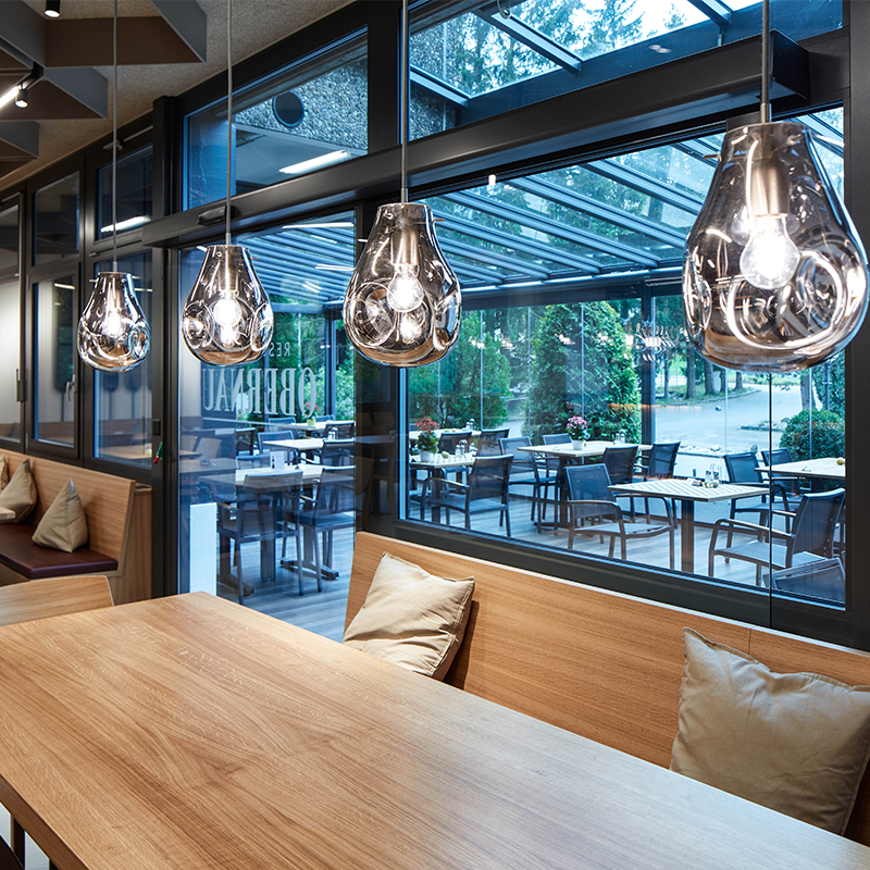 Алюминиевые элементы добавляют конструкции графичности и аккуратного индустриального акцента, подчеркивая современный характер светильника. Благодаря выразительной форме и игре света внутри стекла, он становится стильным акцентом в интерьере — идеально подходит для кухни, столовой или зоны отдыха.