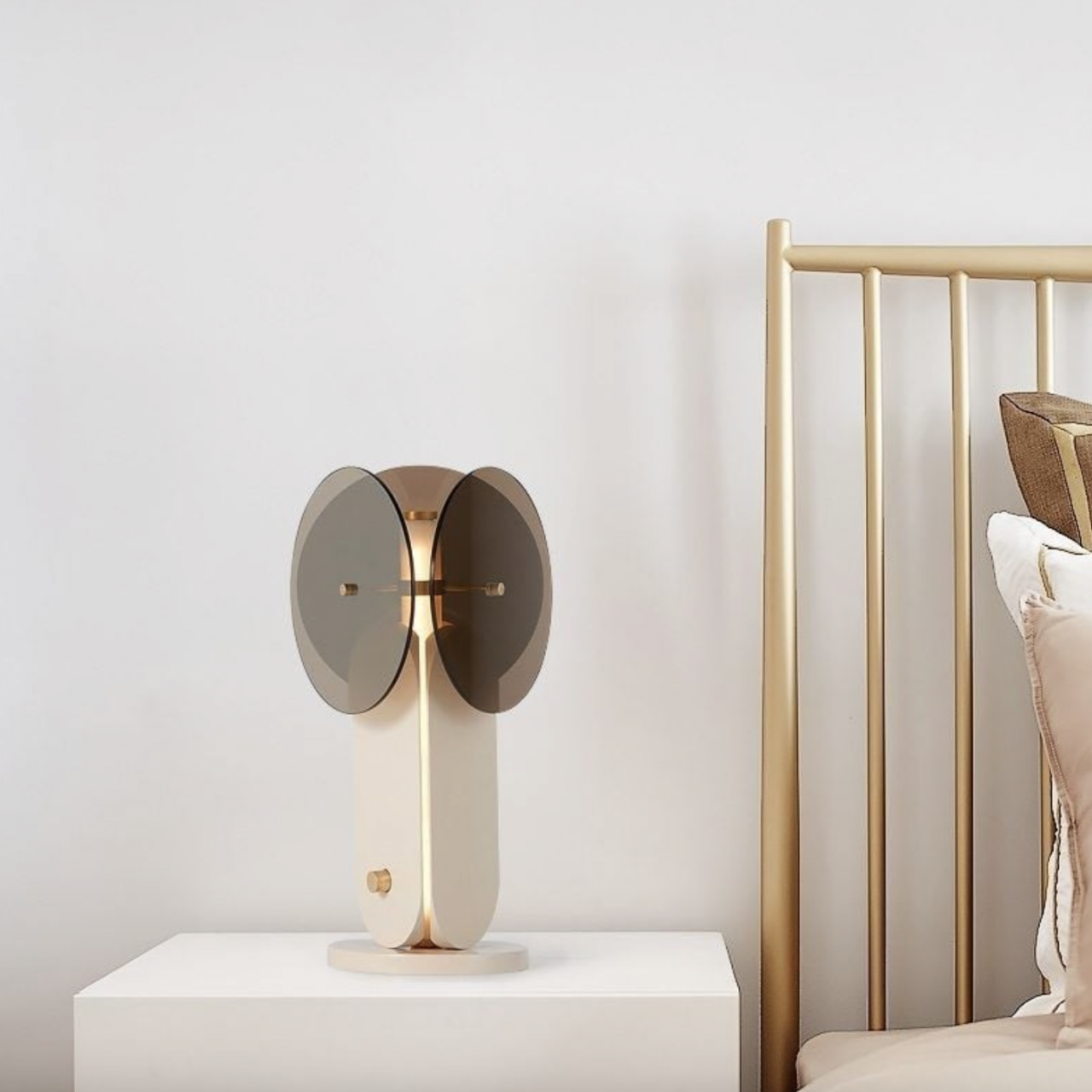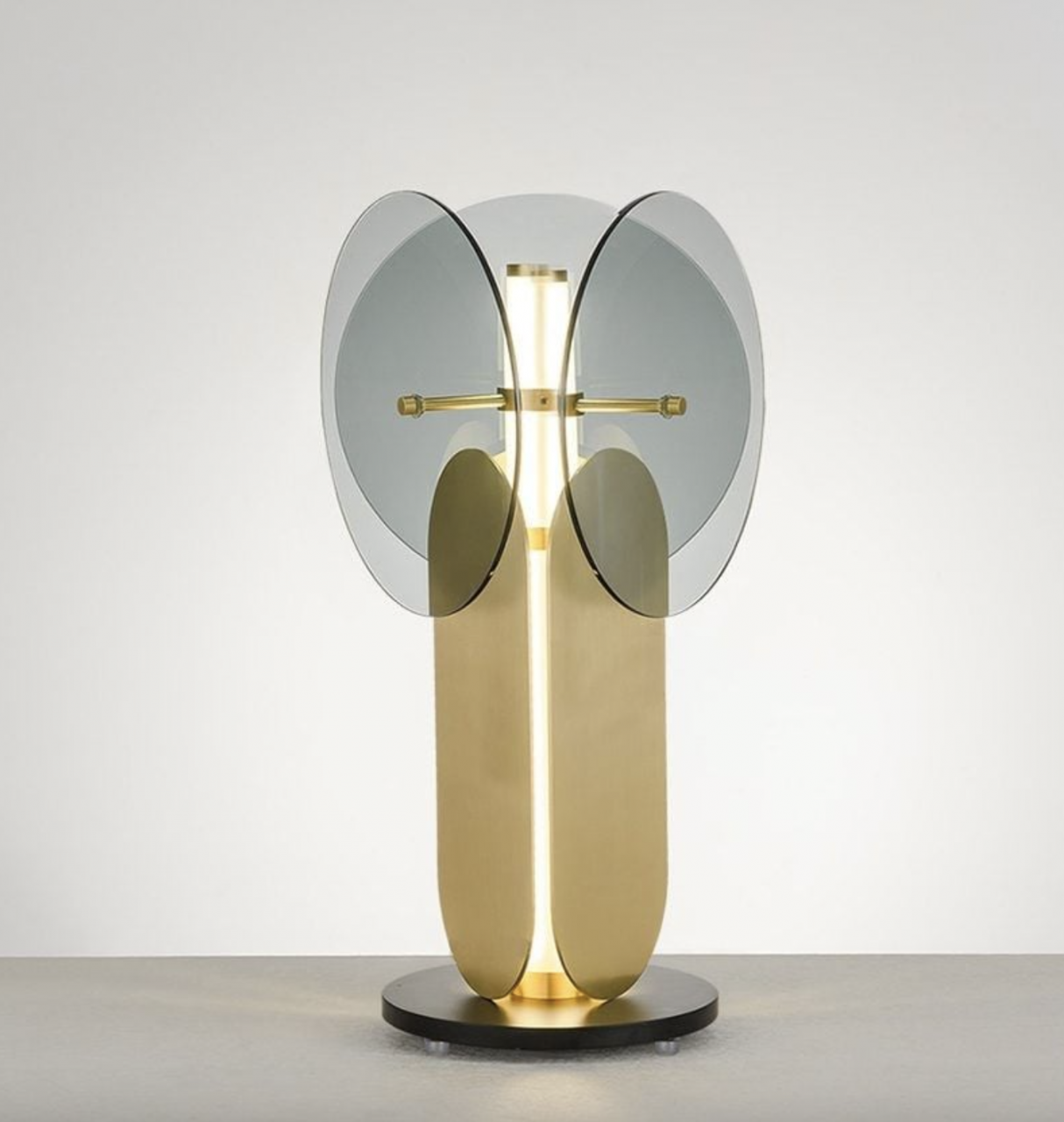 Композиция построена на сочетании лаконичного основания и двух стеклянных дисков, которые создают эффект отражения и глубины. Полупрозрачное стекло мягко рассеивает свет, формируя уютное и камерное освещение.